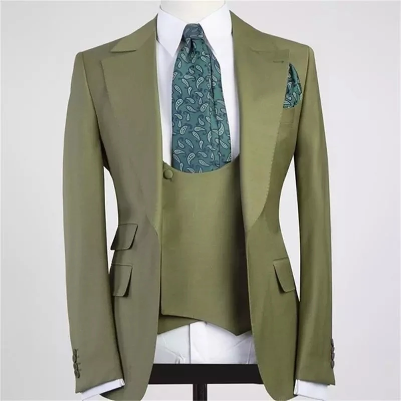 Мужские костюмы из 3 предметов, облегающий Свадебный блейзер + брюки + жилет для жениха с лацканами зеленого цвета с одной пуговицей, новейший дизайн 2021