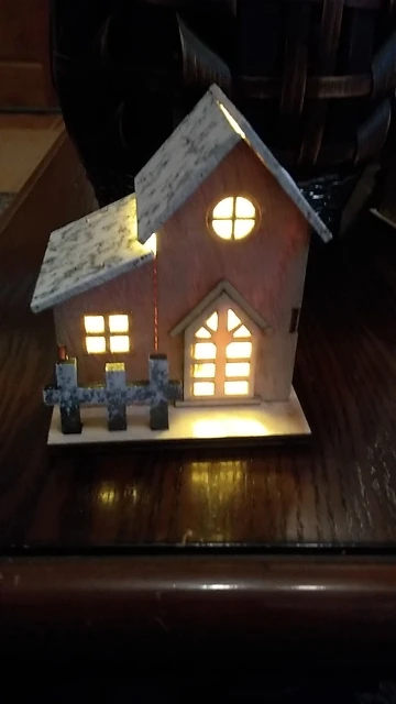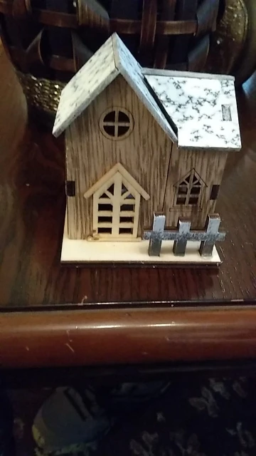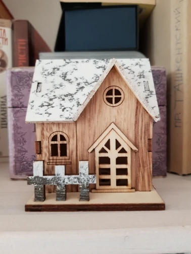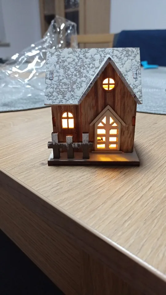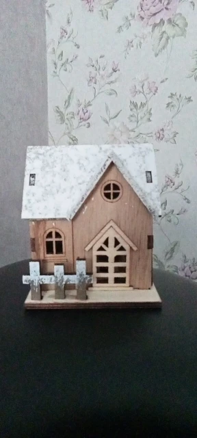 Милый домик, для меня просто идеальный размер : 7х8см высота 9,5см. Упакован в коробку. Батарейка в комплекте. Качество не люкс, но очень достойное, ничего не бренчит, все проклеенно. Рекомендую, мне понравилось.