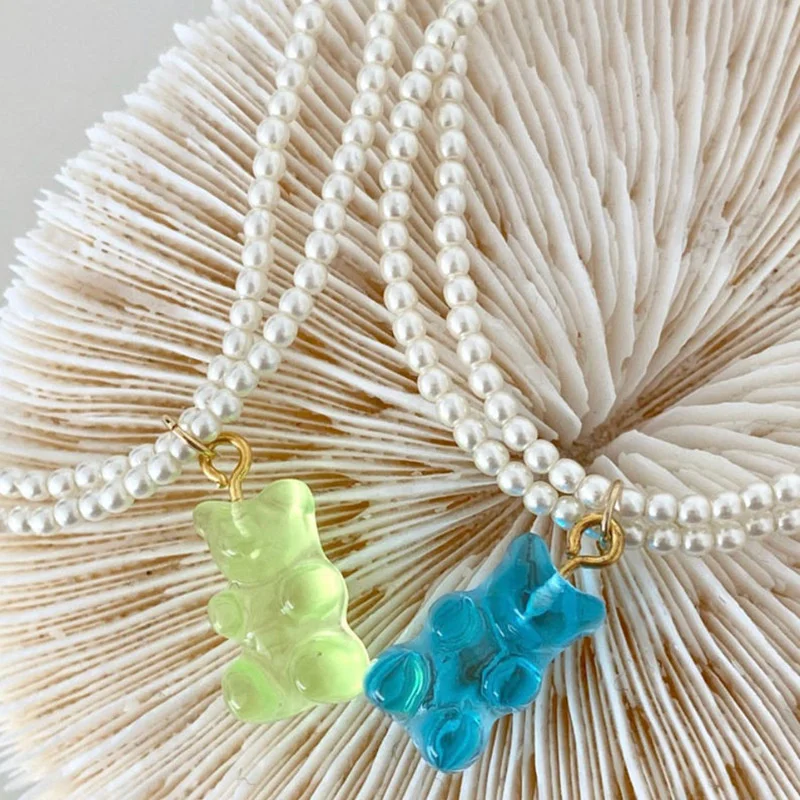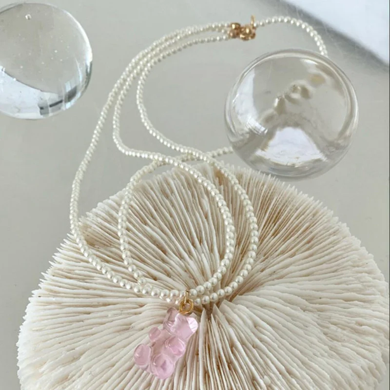 Милое и Элегантное ожерелье из искусственного жемчуга с медведем из смолы милое мультяшное ожерелье конфетных цветов Двойная Цепочка до ключиц женское ювелирное изделие в подарок