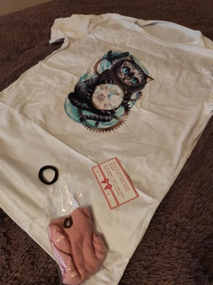 Футболка очень мягкая и приятная к телу, швы аккуратные, рисунок чёткий. Продавцом очень довольна! В подарок к заказу положили носочки, резинку для волос и маленькую открытку с благодарностью. Буду заказывать у этого продавца ещё :)