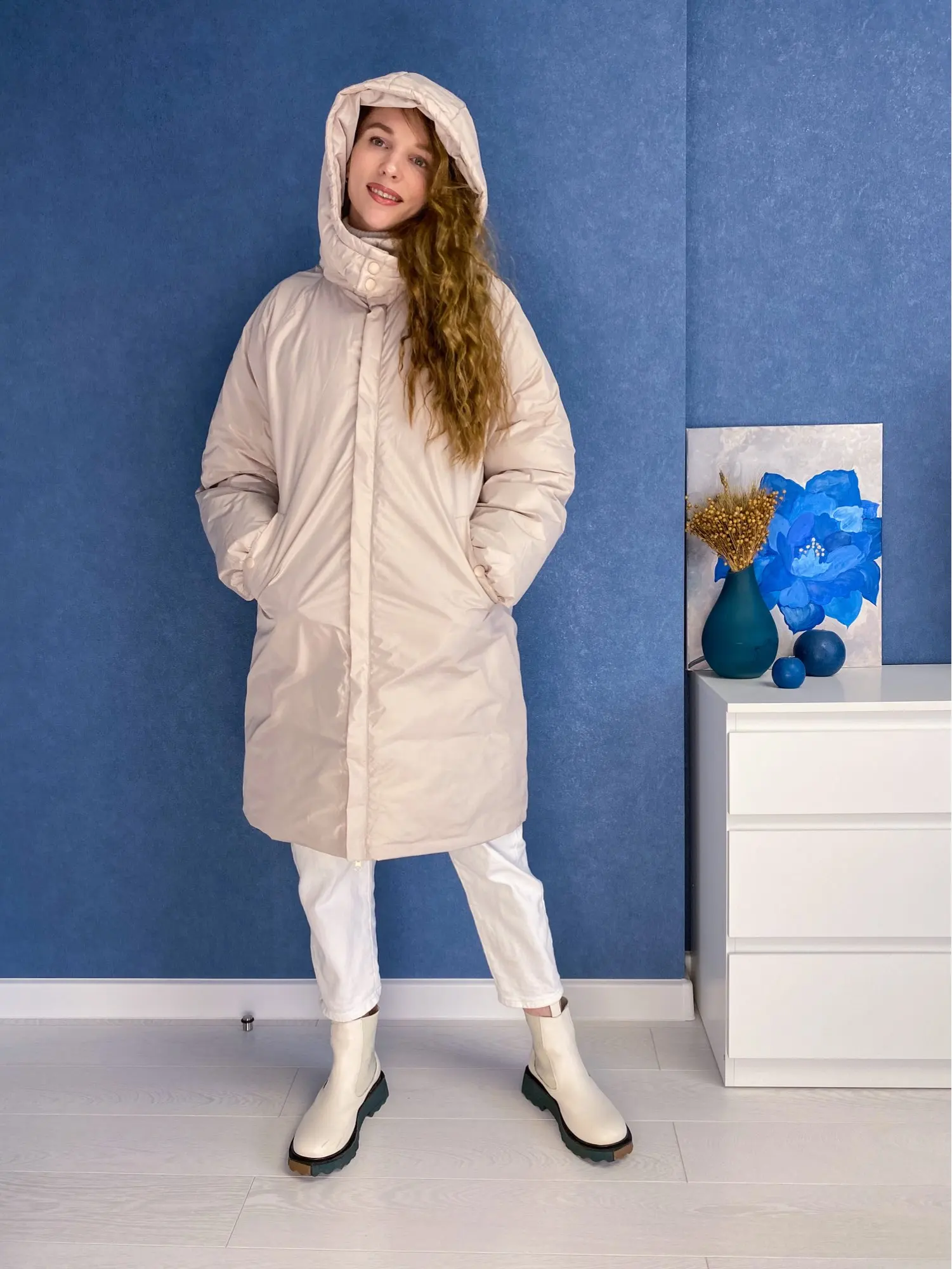 Пуховик зимний. Клевый пуханчик. Не берите размер с запасом, модель оверсайзная. На пар-ры 84-64-90, рост 172 см, я выбрала размер L, он огромный, я в нем, как в одеяле. Рукава полноразмерные, это классно, капюшон объемный, это тоже плюс. На шее кнопки, карманы на кнопках. Молния хорошая, не заедает. Пуховик объемный. Использована приятная, матовая ткань. Выглядит вполне достойно. Приехал помятый, но я его погладила утюгом. Используйте теплый, не горячий утюг для глажки, в противном случае, ткань прилипает с внутренней стороны к синтепону. Набивка пуховика синтепон. Не знаю, насколько он теплый, но на вид внушает доверие. Ins: Masha.sovetuet