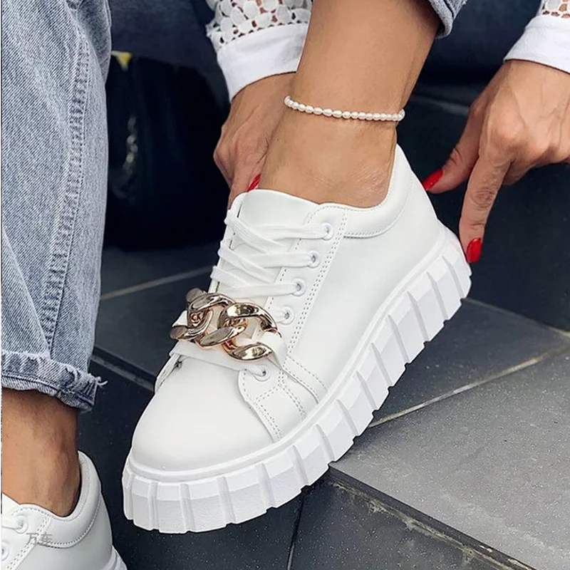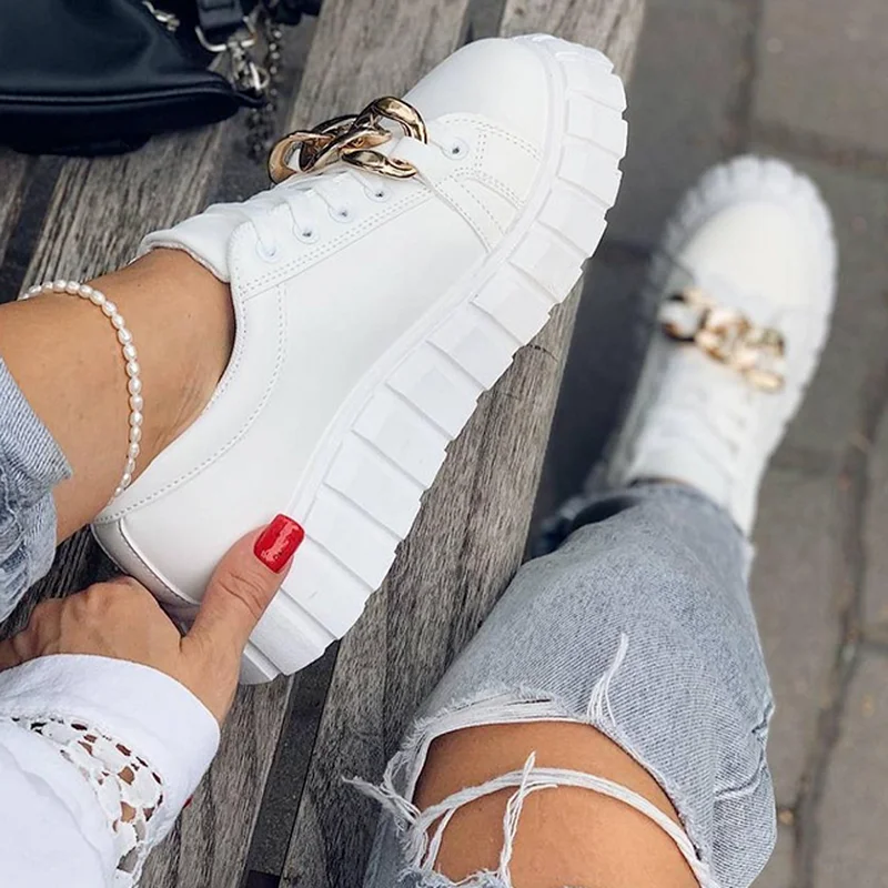 Кроссовки женские на платформе, однотонные кожаные, на шнуровке, на толстой подошве, с цепочкой, модный дизайн, лето