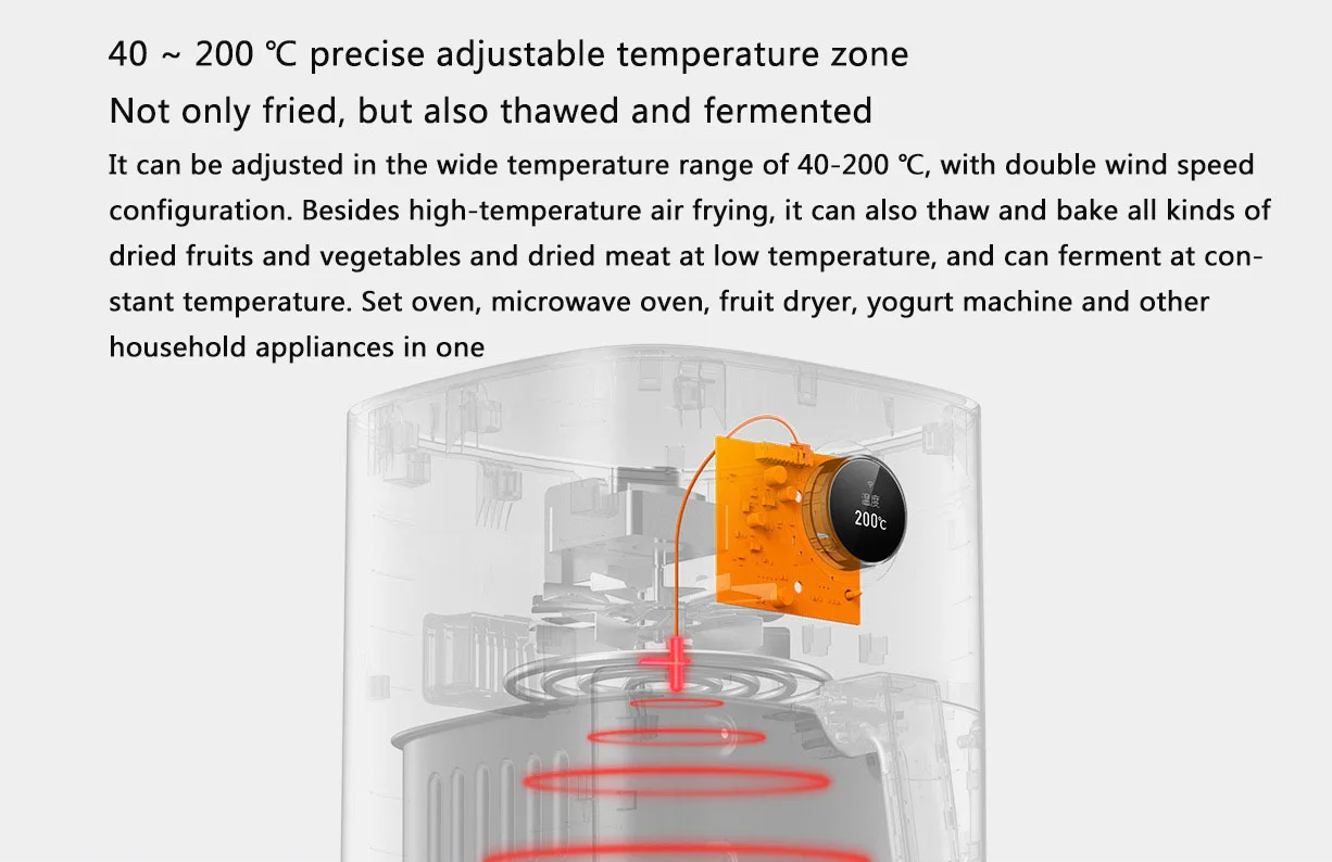 ● Вы можете подогреть устройство или разморозить еду одним нажатием или настроить температуру и время более точно, чтобы достичь наилучшего результата приготовления. С температурным диапазоном от 40 ℃ до 200 ℃, Mijia air фритюрница позволяет вам гриль, Выпекать, жарить и жарить книгу по вашему желанию.