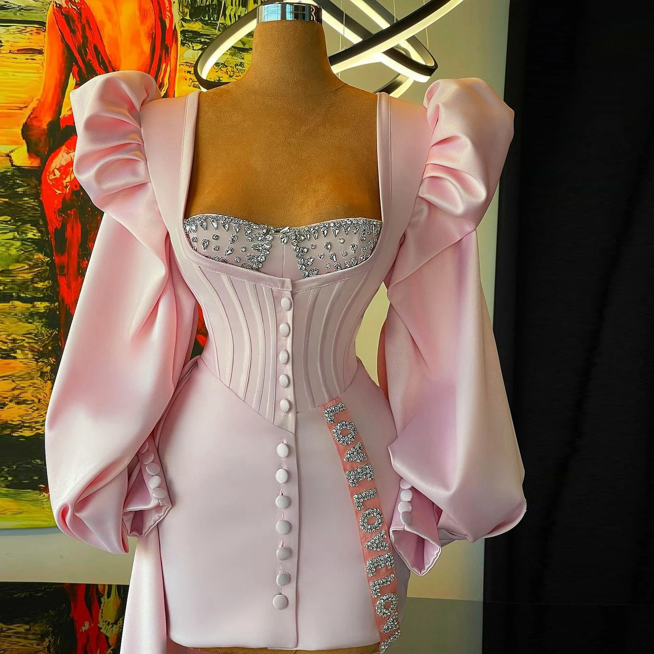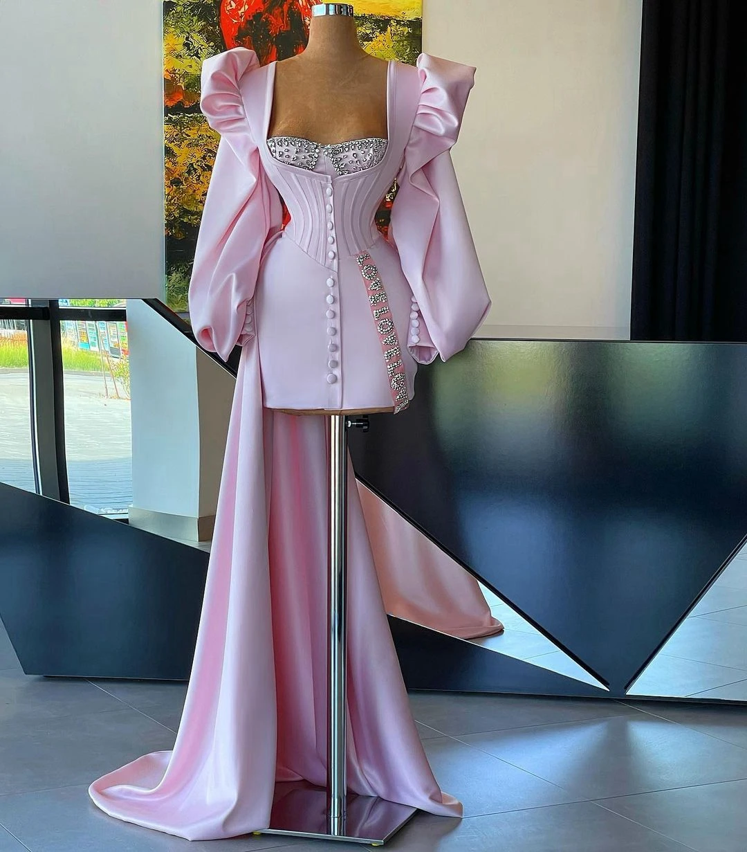 Женское вечернее платье с длинным шлейфом, розовое Элегантное короткое платье для выпускного вечера с пышными длинными рукавами, на пуговицах с кристаллами, для коктейвечерние, индивидуальный пошив