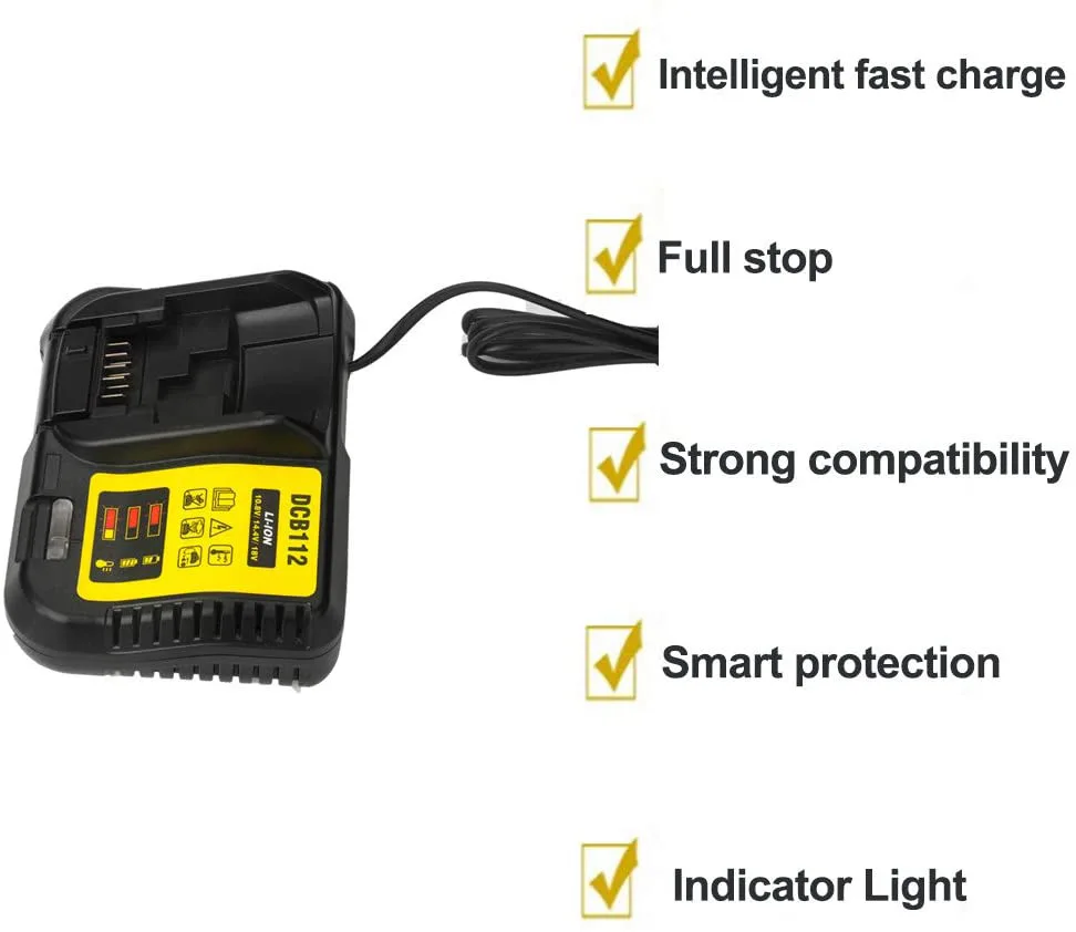 Характеристики: Название: Сменное зарядное устройство для Dewalt Модель продукта: DCB112 Входные параметры: 100-260 В, 50-60 Гц, 0.8A Параметры выхода: 12-20 в, 3A (максимальное выходное напряжение менее 22 в) Размер изделия: 180*140*90 мм/7,09*5,51 * 3.54in Размер посылка: 180*140*90 мм/7,09*5,51 * 3.54in Посылка Вес: 420 г/0.93lb