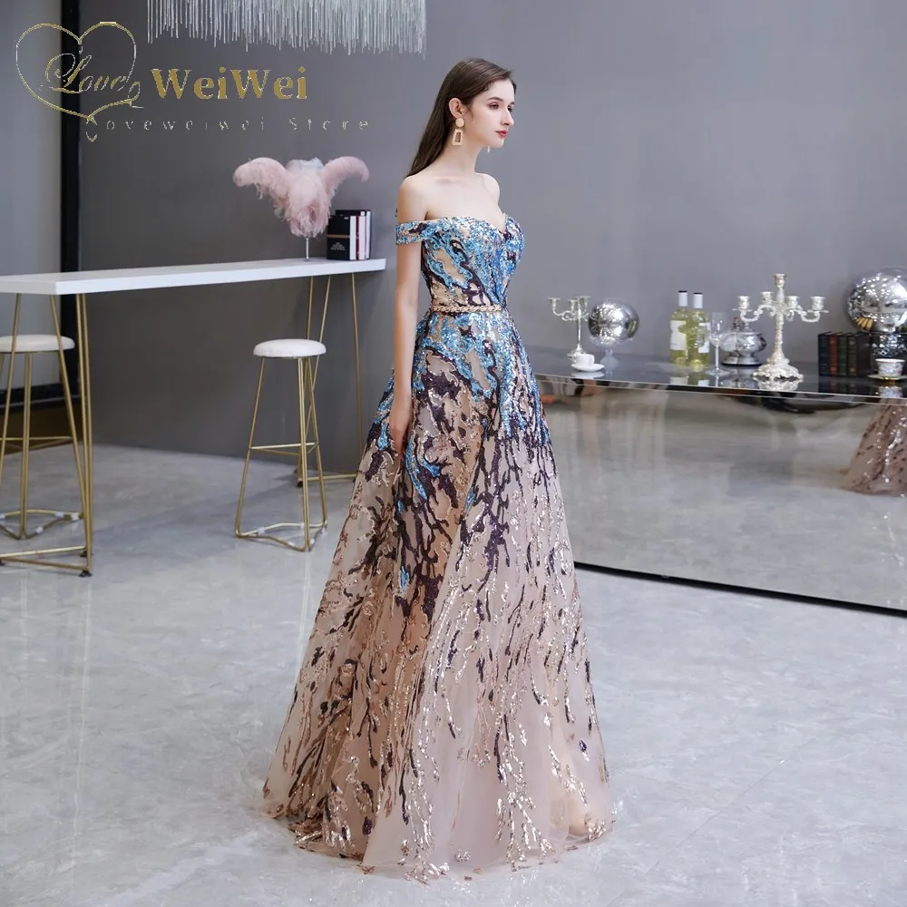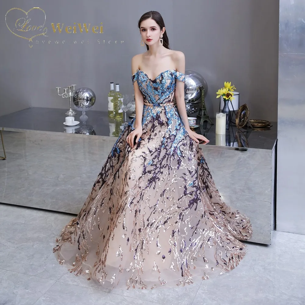 Платье для выпускного вечера контрастных цветов, с вырезом лодочкой, а-силуэт, с открытыми плечами, без рукавов, в пол, с блестками и поясом, вечерние наряды
