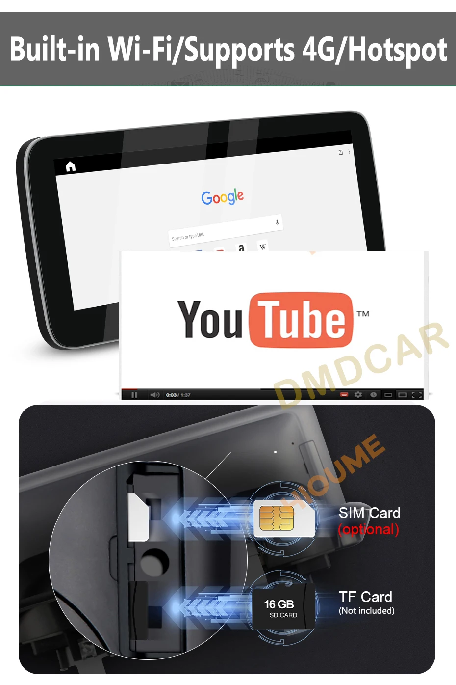 > Поддержка LTE 4G (опционально) и Wi-Fi, есть слот для sim-карты 4G на задней панели. Sim-карта 4G в комплект не входит, вы можете купить ее на местном рынке. Поддерживает точку доступа, вы можете подключить плеер к Интернету через точку доступа Wi-Fi со смартфонов.