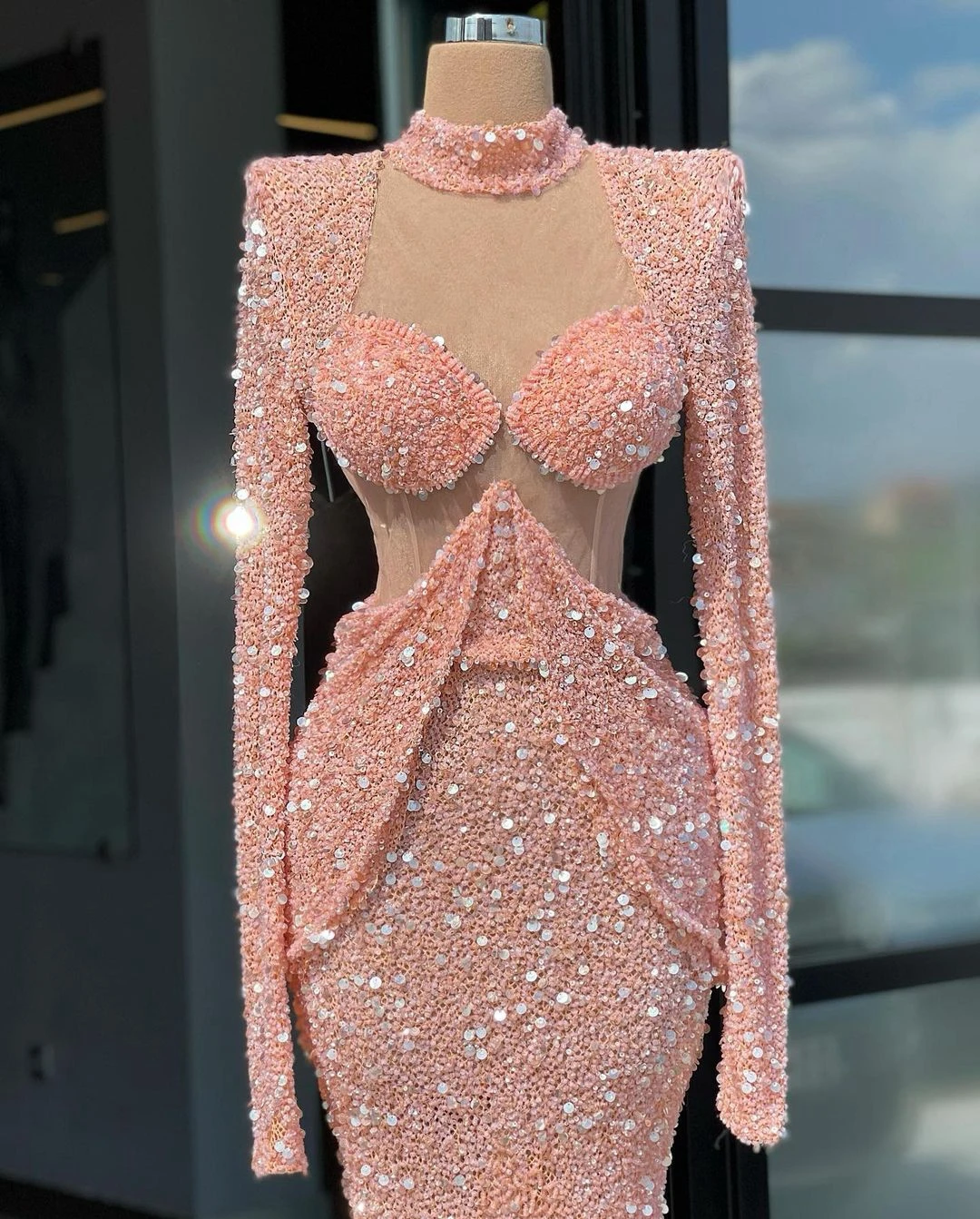 Новое модное розовое блестящее вечернее платье с длинным рукавом и блестками, женское платье русалки для выпускного вечера, элегантное платье на заказ