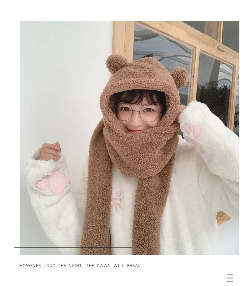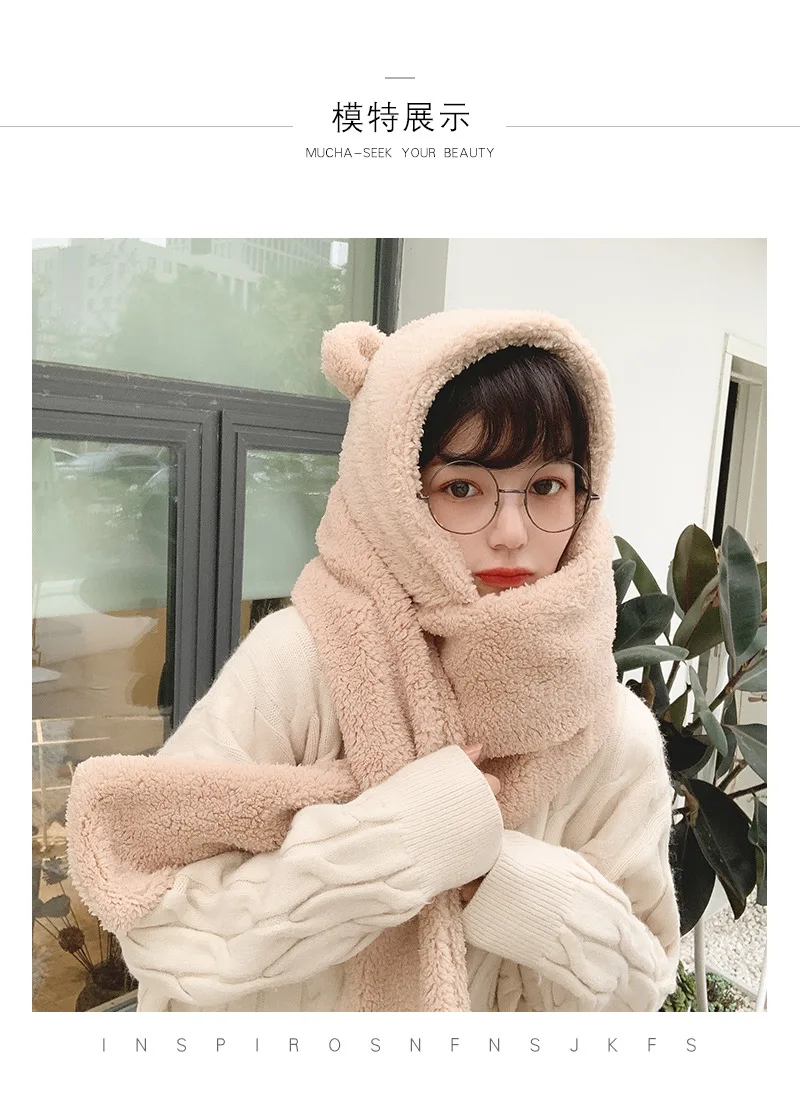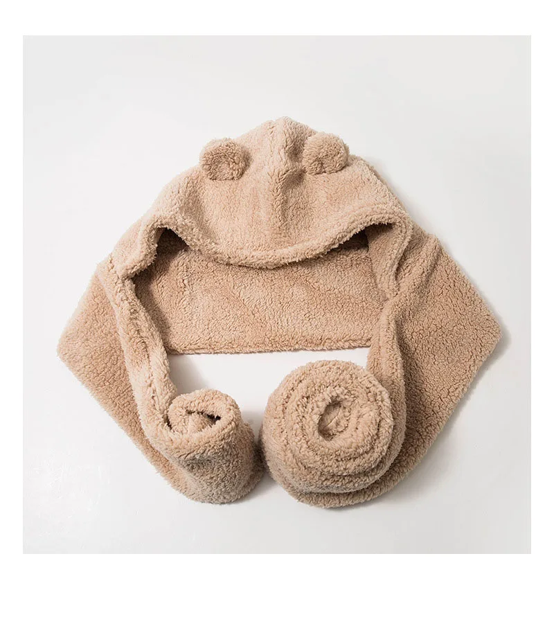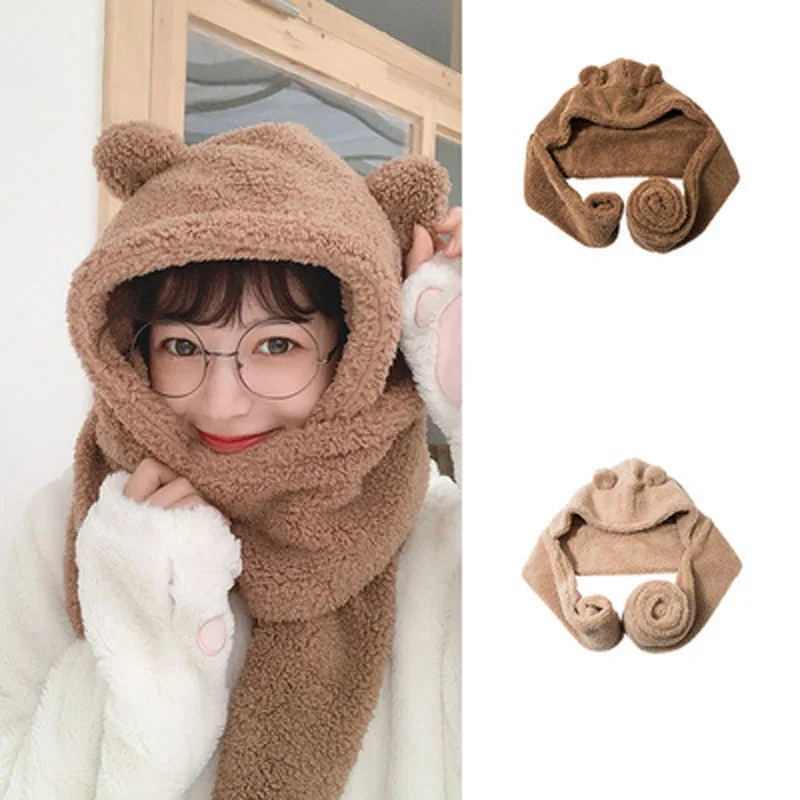 Медвежья шапка шарф все в одном Симпатичная зимняя двухслойная теплая шапка из ягненка