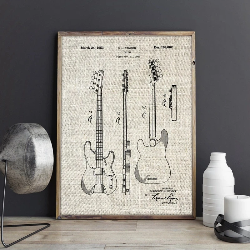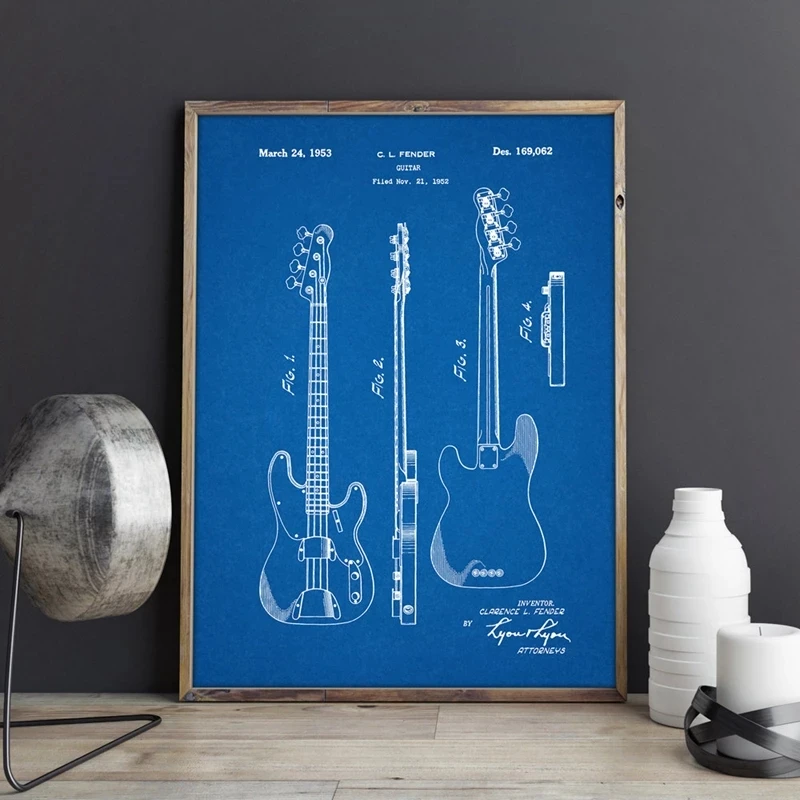 Прецизионный бас патент крыло гитара схема винтажные плакаты и принты музыкант подарок идея холст живопись дома настенное Искусство Декор