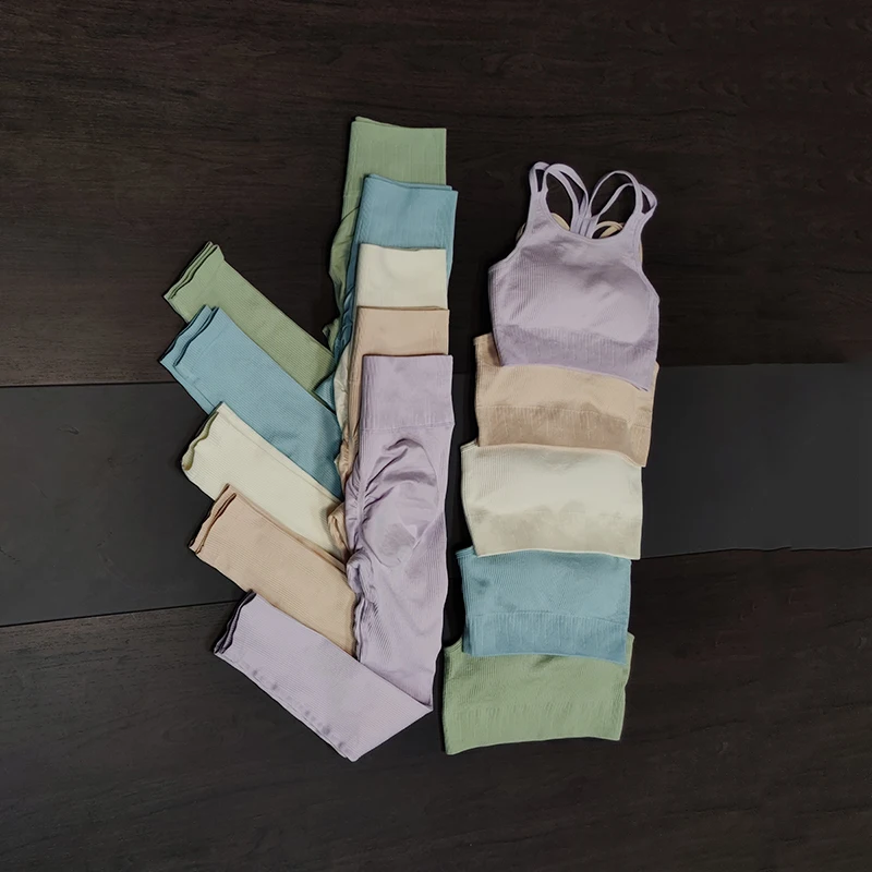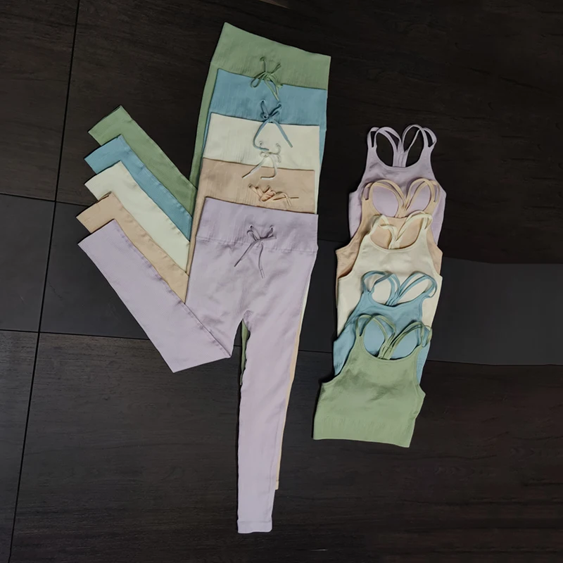 Женские спортивные костюмы из 2 предметов, бесшовные комплекты для йоги, Пузырьковые леггинсы для фитнеса и тренажерного зала, Привлекательный бюстгальтер, спортивные костюмы для девушек, комплекты для бега карамельных цветов