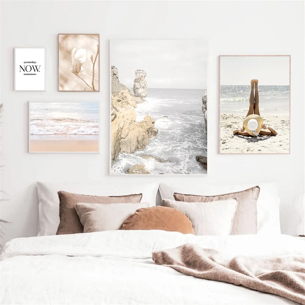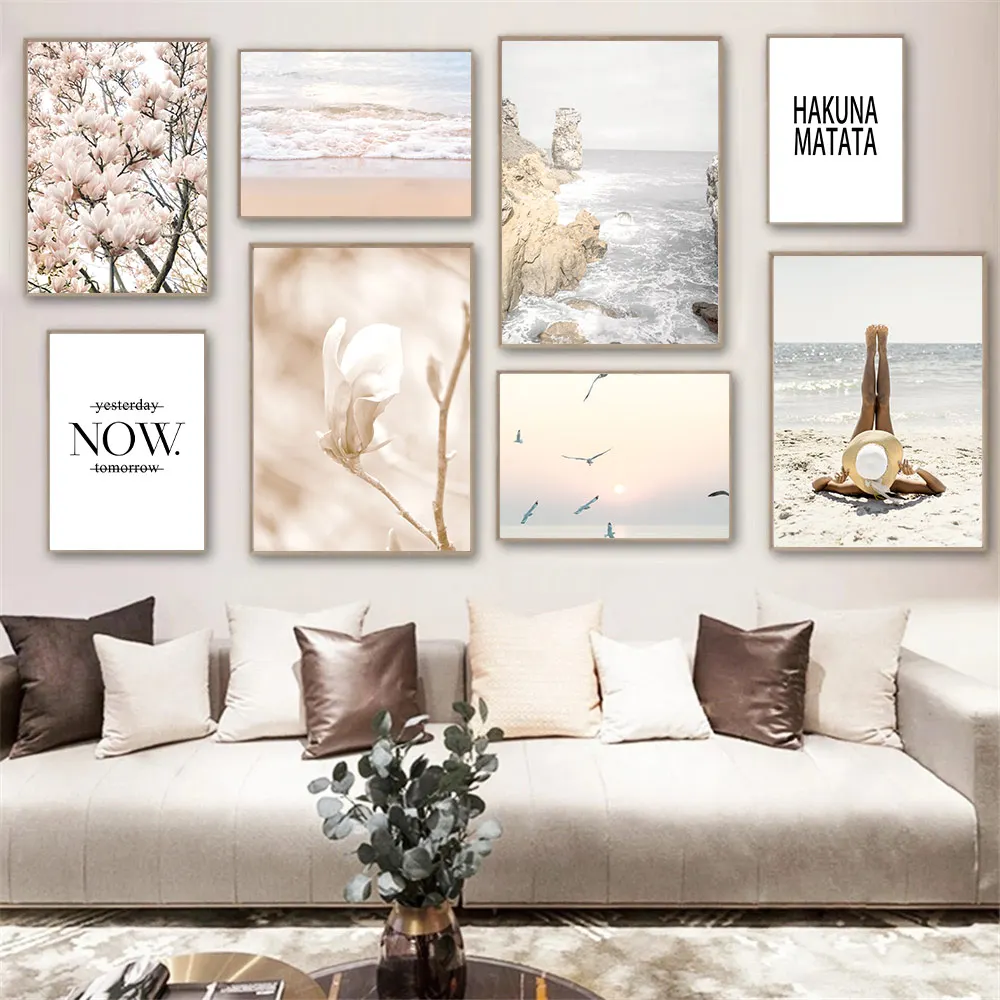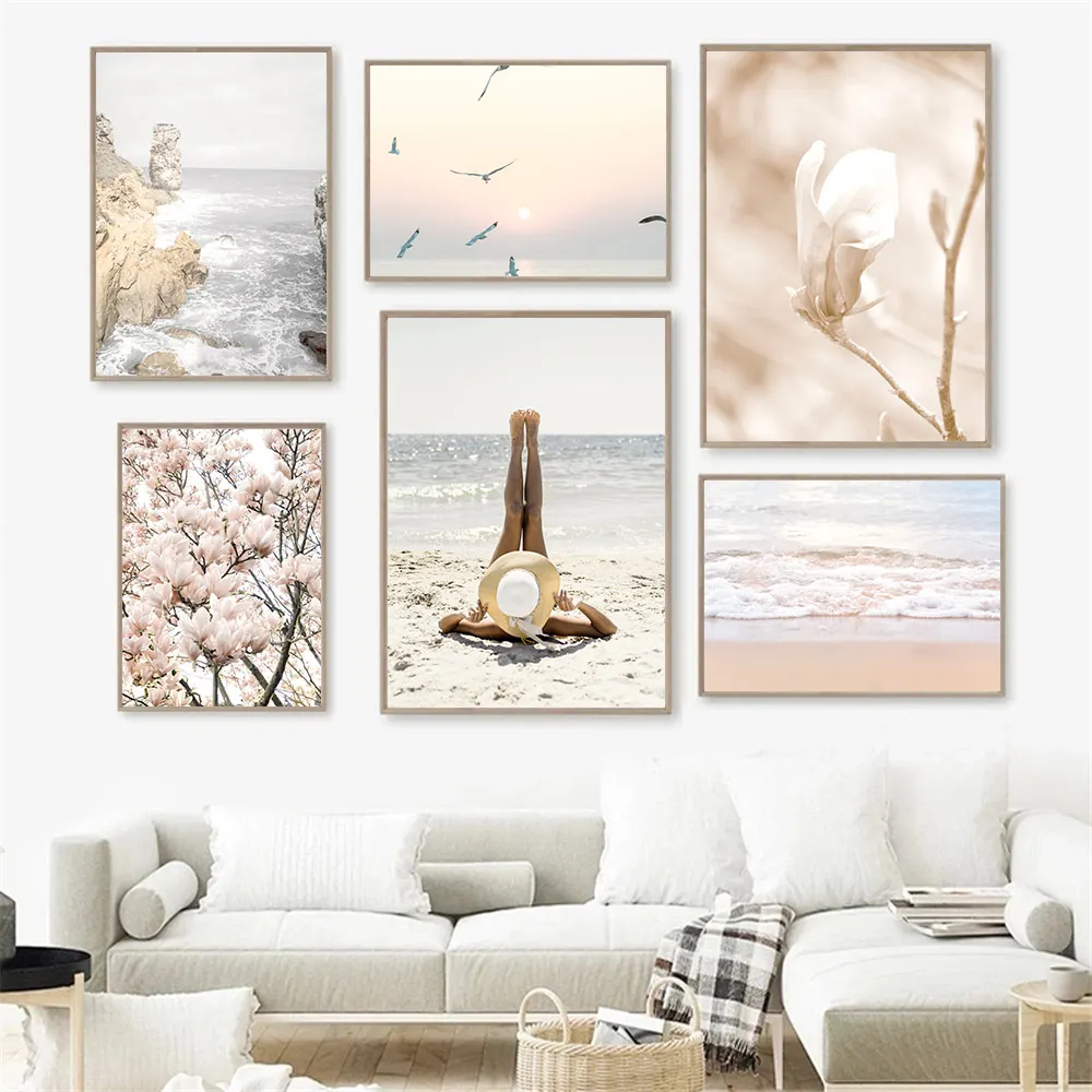 Пляжная волна девушка холст Картина океан Пейзаж Плакат Чайка цветок бежевая стена искусство печать скандинавский настенный картины украшение для дома