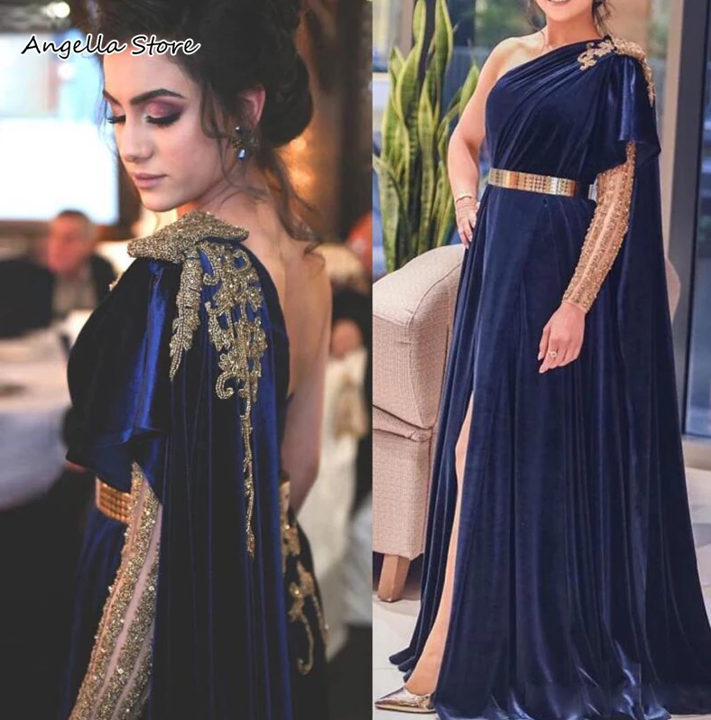Элегантные темно-синие вечерние платья Дубаи на одно плечо Длинные А-силуэт бархатные деловые платья золотые бусины до бедра прорезы арабский выпускной