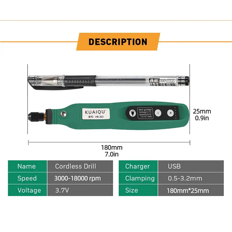 1. Светодиодный рабочий светильник2. Скорость регулирования-этот Электрический инструмент для резьбы имеет 5 регулировок скорости, диапазон регулировки скорости: 3000-15000 об/мин.3. Полные аксессуары-оснащены 24 аксессуарами для бурения, все готово и завершено.4. Идеальная шлифовальная машина-идеальная электрическая шлифовальная машина для резки, гравировки, фрезерования, шлифования, полировки, удаления и сверления. Набор гравировки шлифовальной машины необходим для самостоятельной резьбы и шлифования.5. Подходит для Нефритового агата, ядерной резьбы, резьбы по дереву, шлифовки алюминиевой пластины, тонкой медной доски, пластиковой доски, ДСП, печатной платы, эпоксидной доски.6. Прочный и надежный-небольшого объема, светильник вес, легко взять с собой, удобная рукоятка из биметаллического, лучше контролировать предлагает при бурении, удобно в использовании.Для безопасного использования:1. Когда вы закончите использование устройства, выключите двигатель и убедитесь, что все движущиеся части полностью остановились.2. Прежде чем использовать дополнительные аксессуары, не включенные в этот набор, всегда сравнивайте максимально допустимые RPM этого конкретного аксессуара с RPM этого инструмента.3. В чехол o электрические или механические неисправности, немедленно выключите инструмент.4. Не активируйте переключатель при смене аксессуаров.5. Никогда не используйте замок вала, когда плата работает.6. Убедитесь, что размер цанги соответствует размеру вала аксессуара.7. Храните инструмент в местах, где температура не будет превышать 50 градусов Цельсия.Тип Название: 5-ступенчатая-дрельБатарея: литиевая батареяВремя зарядки: 2 часаНапряжение зарядки: 5 В постоянного тока (USB)Собирать зажимы Диаметр: 0,5-3,2 ммСкорость: 3000/6000/9000/12000/15000 об/минEngravingOutput Напряжение: 3,7 VНоминальная входная мощность: 10 ВтНоминальное напряжение: 110 В ~ 220 ВВаш упаковочный лист выглядит следующим образом:Комплект 1 включает в себяHB-202 электрическая шлифовальная машина x1Аккумулятор (встроенный) x1Сертификат соответствия x1Наконечники x 160 шт.Синий нож для резьбы * 2 шт.Настольный коврик А5*1 шт.Желтая кисть * 1 шт.Комплект 2 включает в себяHB-202 электрическая шлифовальная машина x1Аккумулятор (встроенный) x1Сертификат соответствия x1Наконечники x 160 шт.Комплект 3 включает в себяHB-202 электрическая шлифовальная машина x1Аккумулятор (встроенный) x1Сертификат соответствия x1Наконечники x 120 шт.Комплект 4 включает в себяHB-202 электрическая шлифовальная машина x1Аккумулятор (встроенный) x1Сертификат соответствия x1Наконечники x 60 шт.Комплект 5 включает в себяHB-202 электрическая шлифовальная машина x1Аккумулятор (встроенный) x1Сертификат соответствия x1Наконечники x 20 шт.