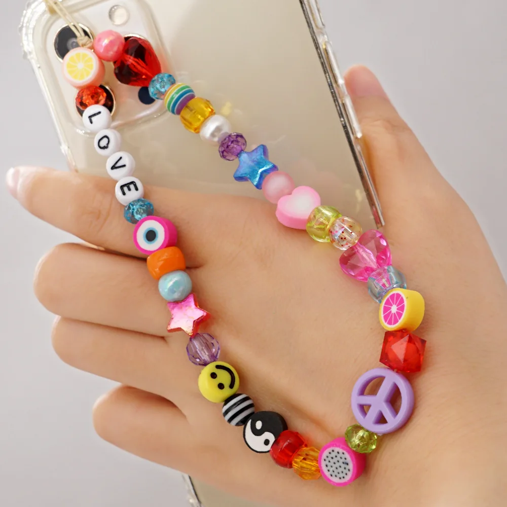 Брелок для телефона с глазным смайликом, с цепочкой, с бусинами, с жемчугом, мягкий керамический ремешок, брелок для женщин, чехол для сотовых телефонов, подвесной шнур