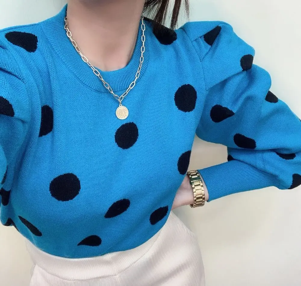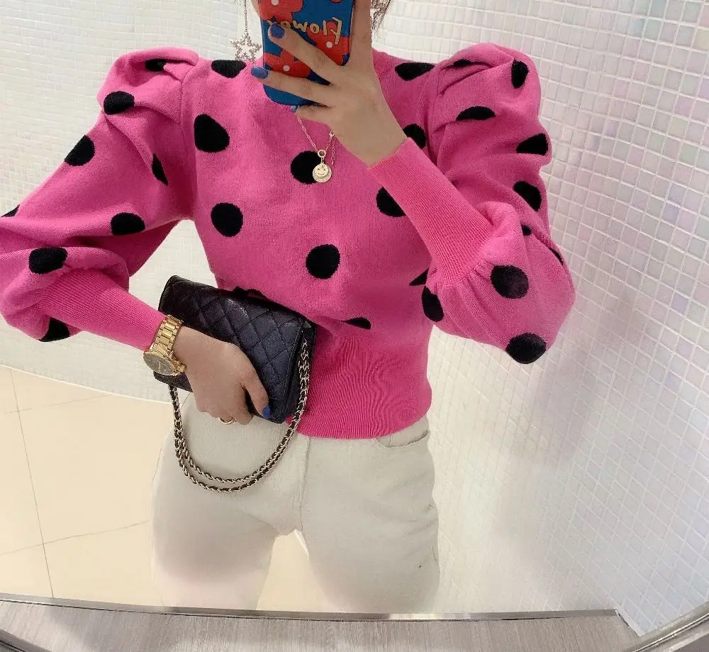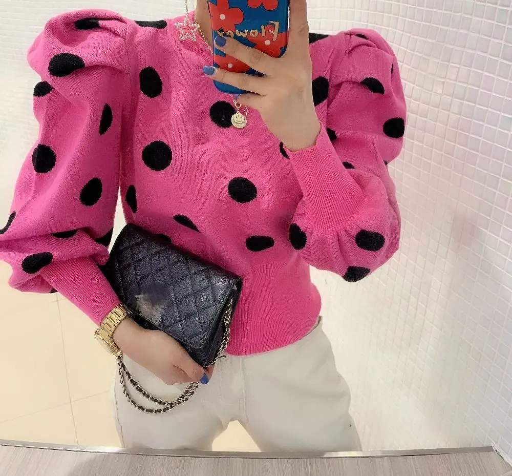 Корейский шикарный свитер, Женский Стильный пуловер с пышными рукавами на осень и зиму 2021, свитер, женская трикотажная одежда в горошек, джемпер, топы для женщин