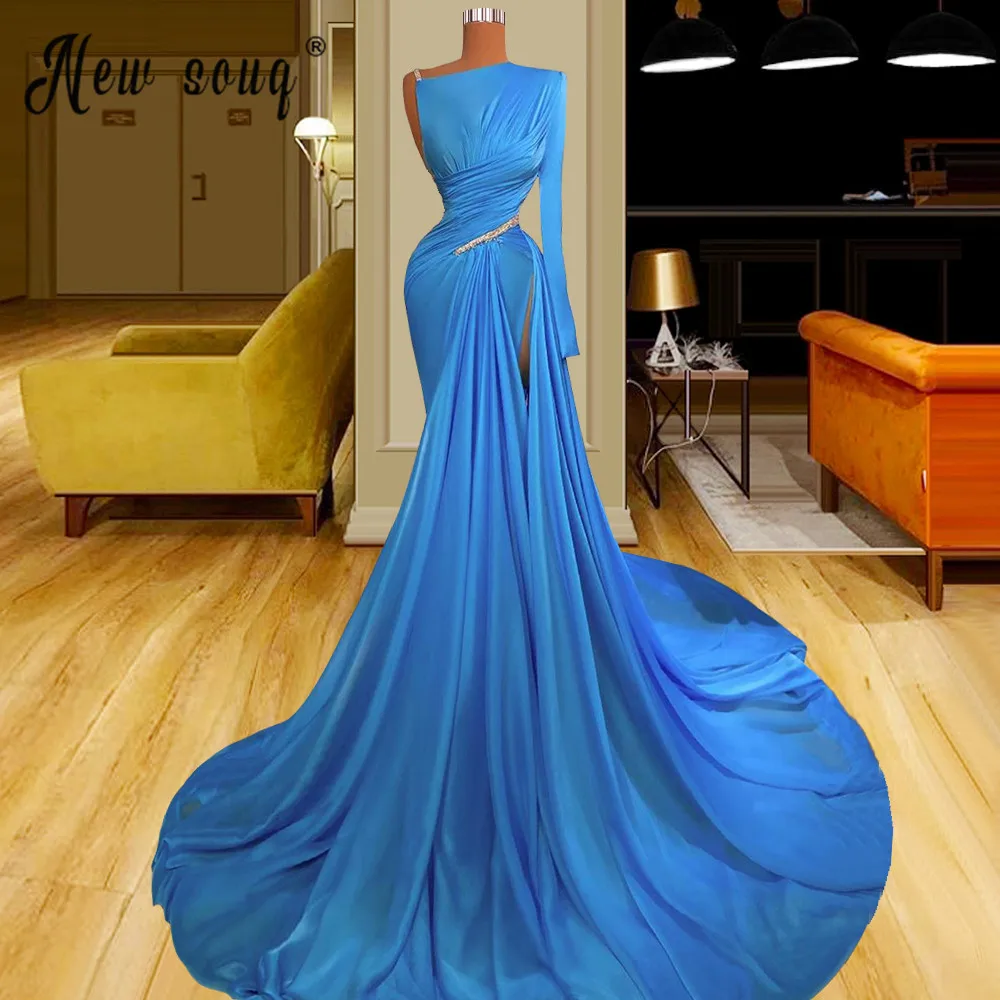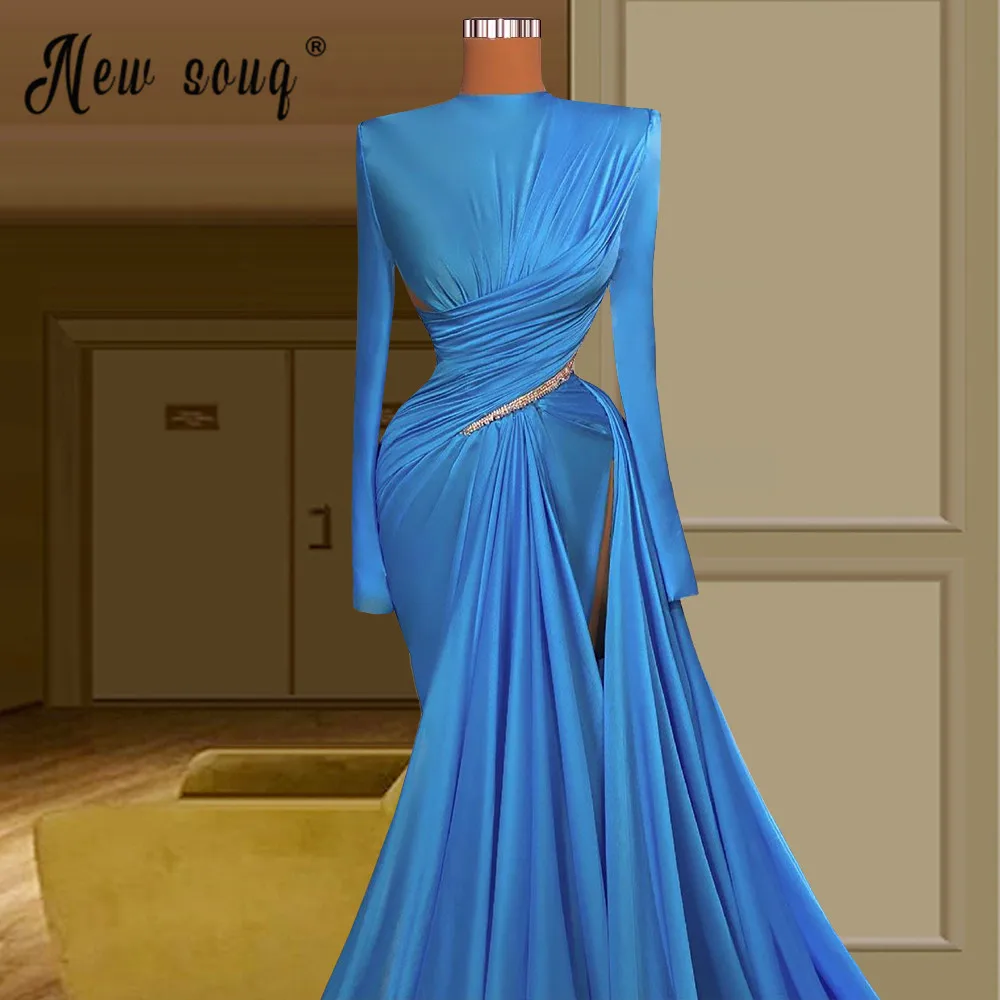 Длинные платья для выпускного вечера, с длинным рукавом, с разрезом сбоку, Королевского синего цвета, из сатина, с хвостом, 2021