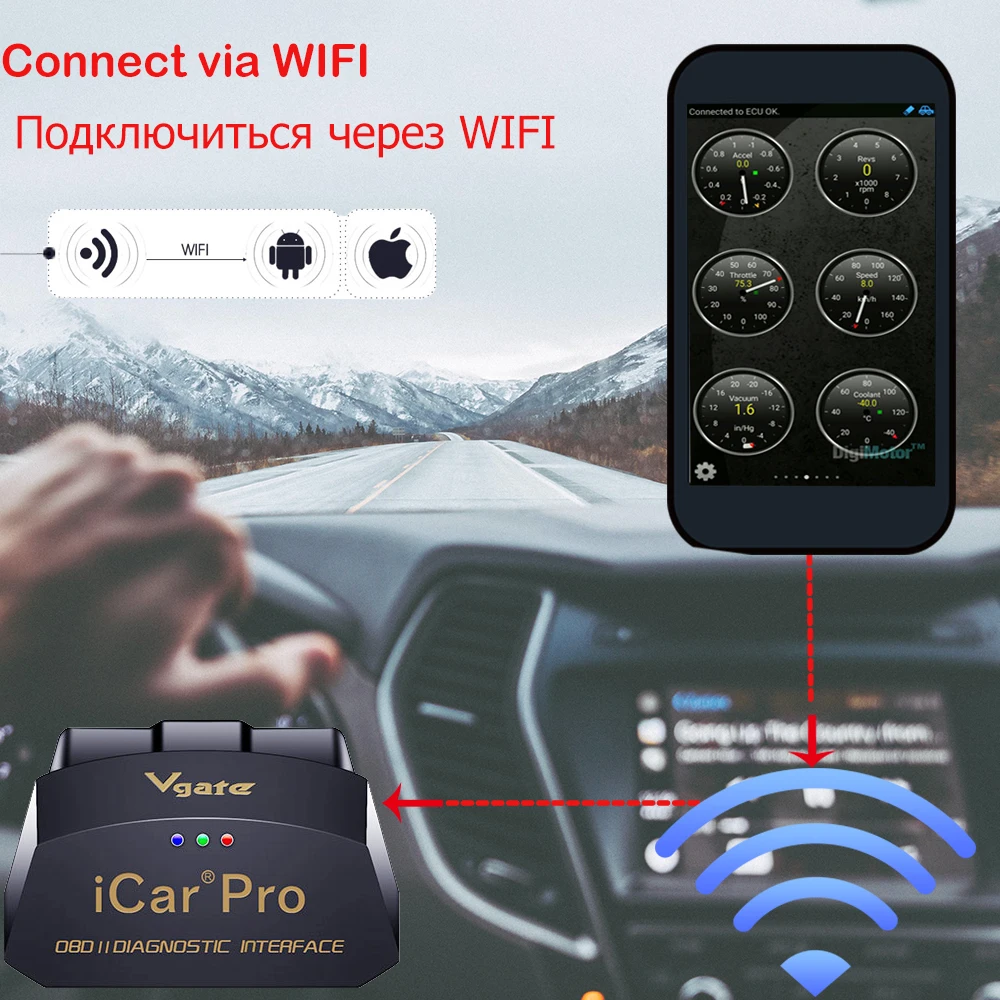 Адаптер Vgate iCar Pro OBDII-это мощный автомобильный диагностический инструмент. Он совместим со всеми спецификациями OBD II / EOBD. Различные модели беспроводного подключения для подключения вашего смартфона или планшета. Он считывает данные автомобильного двигателя в режиме реального времени, такие как скорость двигателя, время зажигания, обшивка топлива, температура воды, расход топлива, он поддерживает различные приложения OBD II.