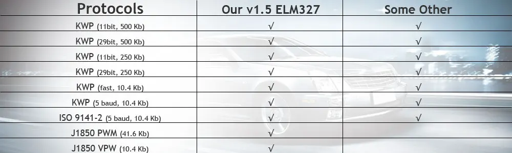 SAE J1850 PWM (41,6 кбод) SAE J1850 VPW (10,4 кбод) ISO9141-2 (5 бод инициализации, 10,4 кбод) ISO14230-4 KWP (5 бод инициализации, 10,4 кбод) ISO14230-4 KWP (быстрая инициализация, 10,4 кбод) ISO15765-4 может (11bit ID, 500 кбод) ISO15765-4 может (29bit ID, 500 кбод) ISO15765-4 CAN (11 бит ID, 250 кбод) ISO15765-4 CAN (29 бит ID, 250 кбод) SAE J1939 CAN (29 бит ID, 250 * кбод) USER1 CAN (11 бит ID, 125 * кбод) USER2 CAN (11 * бит ID, 50 * кбод) * Настройки по умолчанию (пользовательский регулируемый)