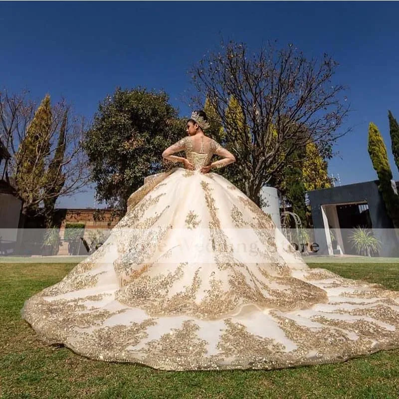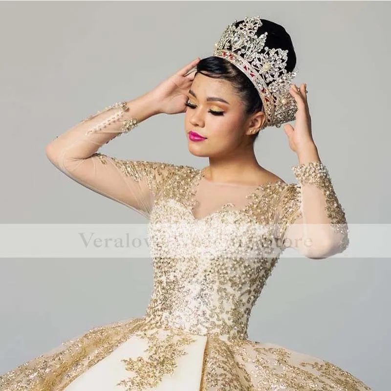 Бальное платье цвета шампанского, бальное платье с глубоким круглым вырезом, длинными рукавами, аппликациями, кружевами и блестками, милое праздничное платье для девушек 16
