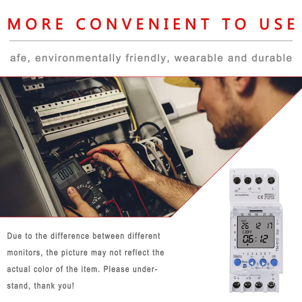 Особенности: 1. Широкое применение: он широко используется в течение 7 дней программируемого управления уличный светильник, неоновый светильник (сигнал), лампа, водонагреватель, кондиционер, афиша, электрическая плита, бустер, опрыскиватель, бутлер, предварительный нагреватель, сельскохозяйственные объекты и оборудование радиовещания и т. Д. 2. Безопасность: цифровой таймер находится внутри сменного аккумулятора cr2032 3 в для аварийного переключения питания. 3. Низкое потребление: Он имеет характеристики низкого потребления, высокоточный CMOS Чип, сильно анти-блокирующий, простой и простой в определении, подтверждает IEC 60367ECECertified. 4. Простая установка: этот продукт очень прост в установке, дополнительные инструменты не требуются, и процесс установки очень удобен. 5. ЖК-экран: Этот продукт имеет большой ЖК-экран, легко читаемый ЖК-дисплей, вы можете прочитать данные напрямую. Описание: TM612 2-х канальный 24 часа в сутки учета рабочего времени в Китае (стандарты ce, разрешений может автоматически включать и выключать различные виды электрического оборудования в заданного времени перед неделю и может работать циклически в неделю или день (от от mnute до 168 часов) В соответствии с предустановленными программами. Характеристики: Бренд: SINOTIMER Модель: TM612(2 NO + 2 NC) Напряжение источника питания: 220В переменного тока (В) Потребляемая мощность: 16A 3600 Вт (Вт) Сфера применения: 220V пассивный выход Время установки: от 1 минуты до 168 часов Время переключения: 44 раза Способ установки: 35 мм рельсовая установка Посылка включает в себя: 1 * TM612 таймер (кнопочный аккумулятор включен) 1 * Руководство пользователя