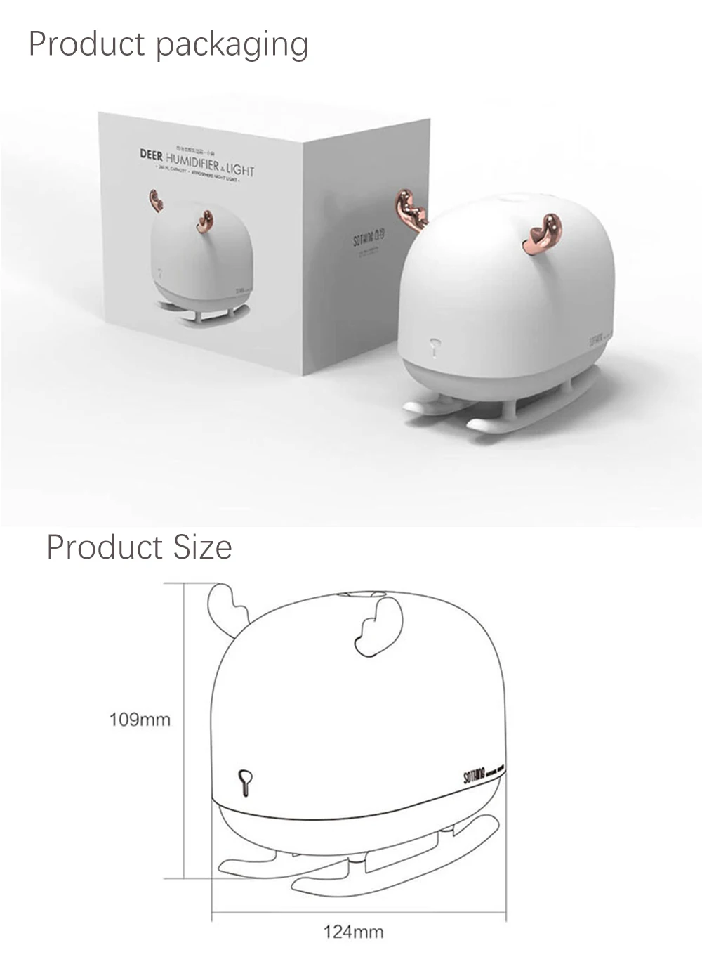 Название продукта: увлажнитель воздуха SothingМодель изделия: DSHJ-H-009Емкость воды: 260 млВходной интерфейс: Micro USBОбласть увлажнения: 5-8 мОбъем распыления: 50 мл/чЦвет лампы: теплый белыйВход: DC 5V 1AВес изделия: 150 гРазмер изделия: 124 мм * 91 мм * 109 мм