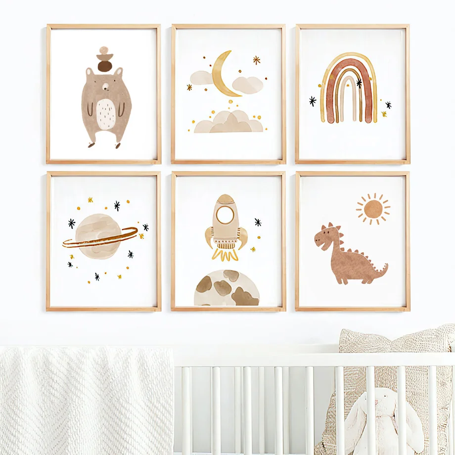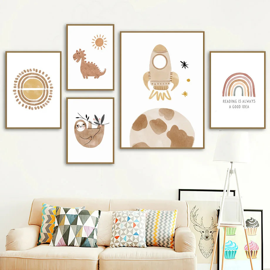 Постер в скандинавском стиле Ленивец медведь динозавр Солнце Луна Радуга земля Бохо настенный художественный принт холст картина настенные картины декор для детской комнаты