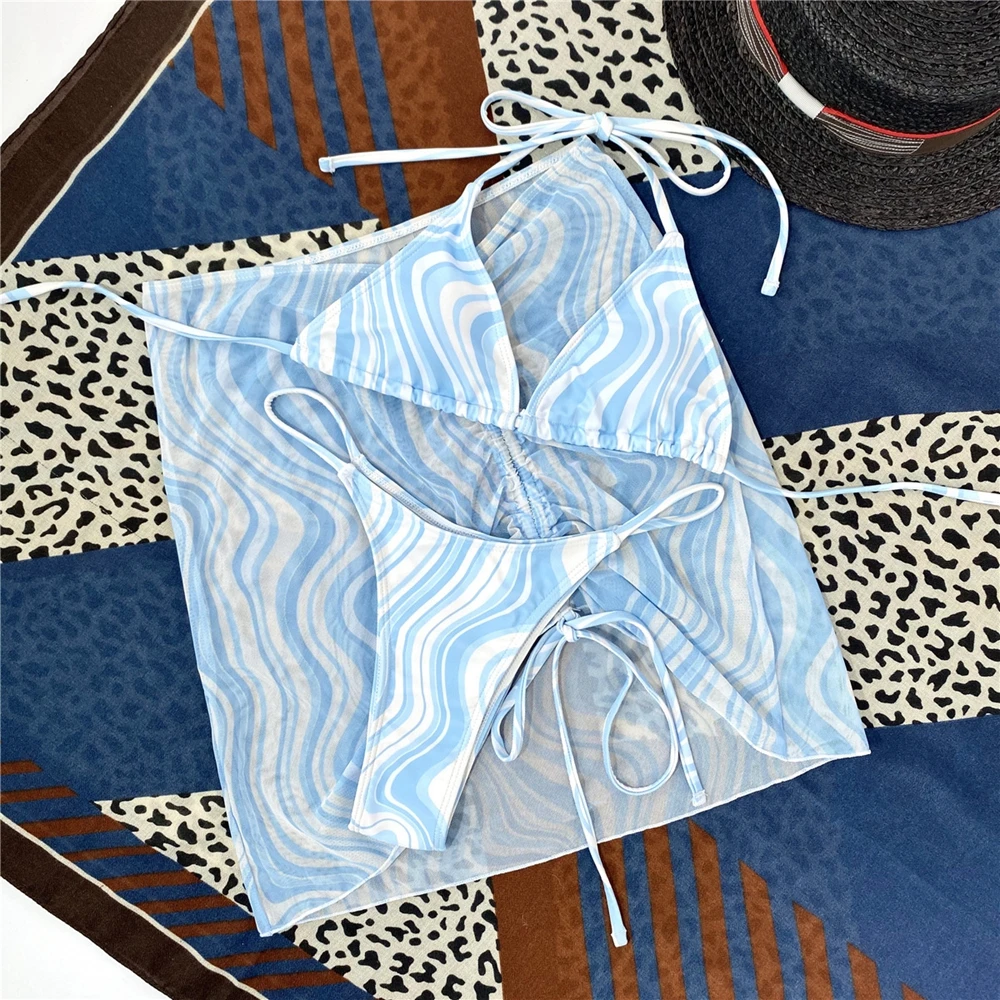 Комплект бикини женский, 3 шт., с лямкой через шею и короткой юбкой, женский купальник бикини