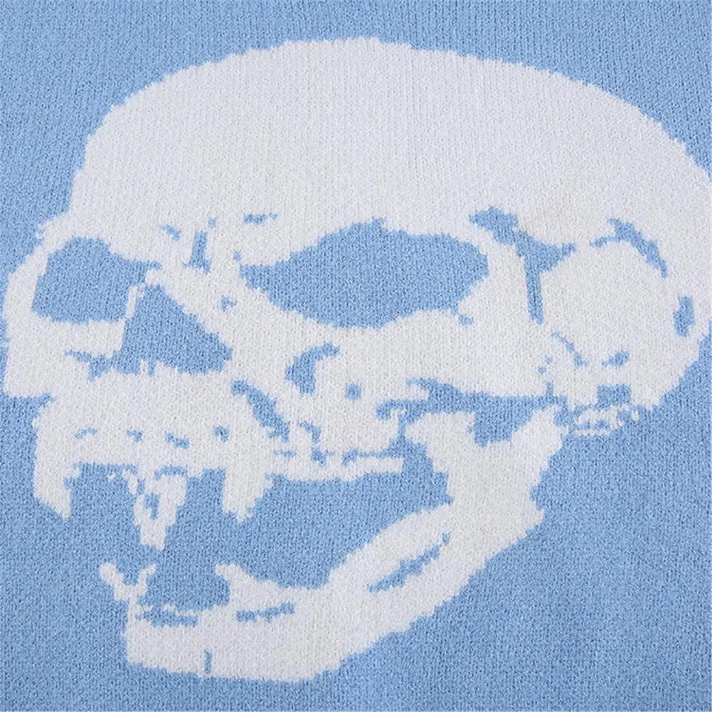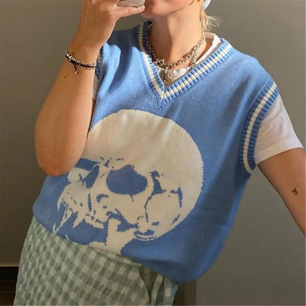Женский трикотажный топ с принтом черепа, голубой Свободный Повседневный пуловер с V-образным вырезом, свитер в стиле ретро, Y2K, осень 2021