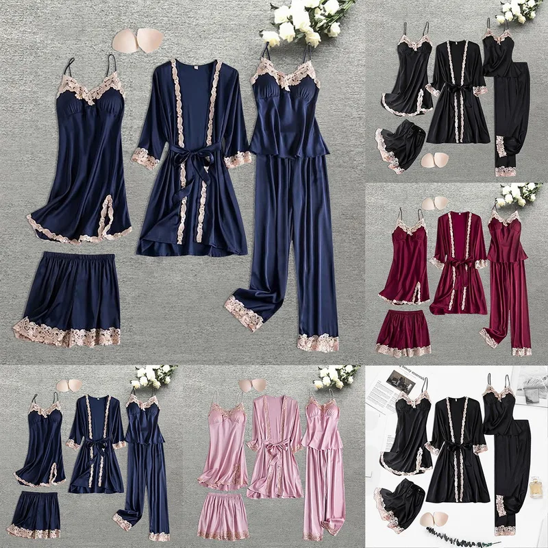Пижамный комплект Женский атласный кружевной, комплект из 5 предметов, ночная рубашка на весну, пижамный комплект с ремешками, одежда для сна с нагрудными подушечками, домашняя одежда