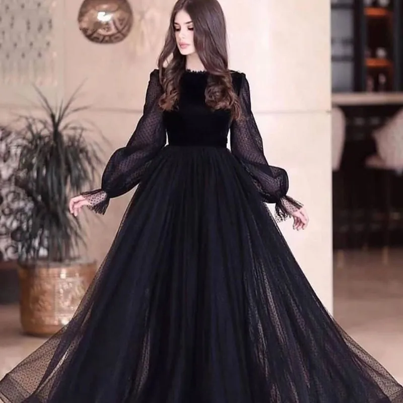 Женское вечернее платье с длинным рукавом, черное платье трапециевидной формы в мусульманском стиле с кружевной отделкой для выпускного вечера