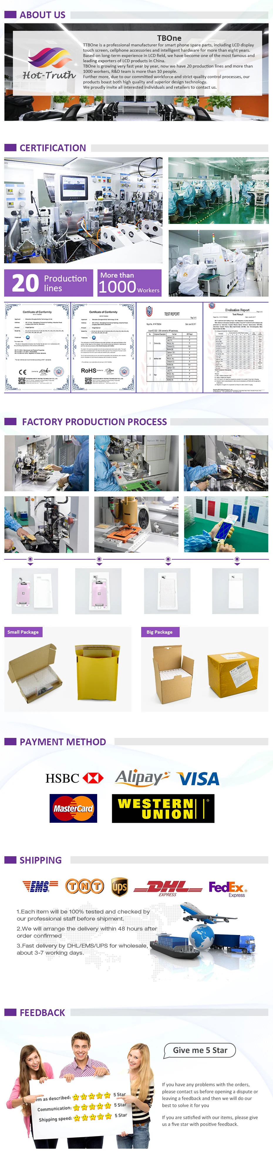 Цвет: черный и белыйТестирование: Каждый ЖК-дисплей проверяется перед отправкой. Мы не заменим товар, который был поврежден во время установки. Этот товар включает следующие детали:1. ЖК-экран;2. Сенсорный экран дигитайзера;3. Передняя рамка;Примечание: Перед установкой проверьте функциональность. Как установить: 1. Смотрите видео-учебник перед началом, убедитесь, что вы знаете все шаги. 2. Проверьте ЖК-дисплей, чтобы убедиться, что гибкий кабель в хорошем состоянии и нет пыли на соединителе. 3. Пожалуйста, держите телефон выключенным при сборке. 4. Отметьте места винтов, поместите винты, которые вы сняли на нужном месте, убедитесь, что все винты обратно в их собственное резьбовое отверстие или это может привести к постоянному повреждению ваш мобильный телефон. 5. Пожалуйста, подключите гибкий кабель к док-станции один за другим и убедитесь, что все коннекторы хорошо сидят. 6. Кабель передачи данных может выскочить, эта ситуация может вызвать белые линии экрана или пустой экран. Когда это произойдет, отключение питания и повторное подключение кабеля могут решить эту проблему. Теплые советы: Перед размещением заказа выберите правильный вариант и цвет. Пожалуйста, попробуйте отремонтировать или заменить работу в сухой и свободной от пыли среде без прямых солнечных лучей. Требуется специальный инструмент для ремонта при разборке и повторной сборке экрана и дигитайзера с рамкой. Установка любых новых деталей должна осуществляться квалифицированным лицом. TBOne не несет ответственности за любые повреждения, вызванные во время установки. Гарантия и политика возврата: 1. Каждый продукт будет полностью протестирован перед поставкой, с помощью специальных инструментов или основных плат для обеспечения работы. 2. Все продукты, гарантия 6 месяцев, 100% абсолютно новое и строго Протестировано перед отправкой, пожалуйста, сообщите нам в течение 3 дней после получения посылки, Если вы недовольны продуктами (реальное изображение и другие доказательства должны быть предоставлены), тогда мы предложим замену/возврат, если товары не соответствуют описанию. 3. Если товар находится в вашем распоряжении более 7 дней, он считается использованным/секундным, мы предлагаем только замену после того, как получим ваш возвращенный товар.