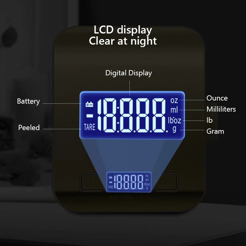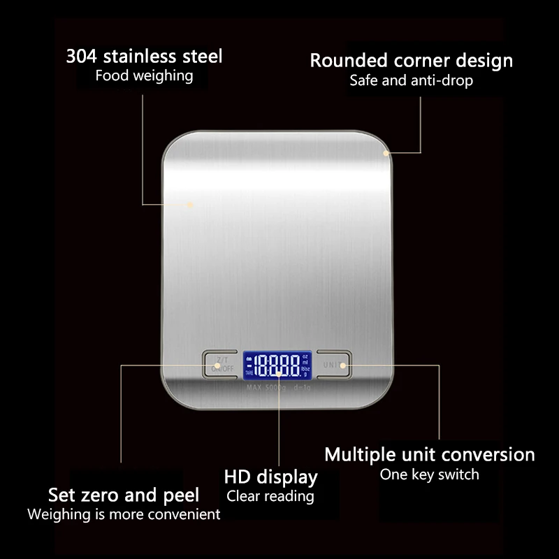 -Единицы измерения: g, lb, ml, oz-Дисплей: ЖК-дисплей с белой подсветкой-нержавеющая сталь с защитой от отпечатков пальцев-автоматическое отслеживание нулевой точки-автоматическое выключение-подсказка о перегрузке: когда этот знак Err появляется во время взвешивания, это означает, что текущая нагрузка превышает максимальный вес. -Переключатель единичного преобразования: его можно преобразовать взаимно, нажав кнопку Unit. -Высокоточный датчик