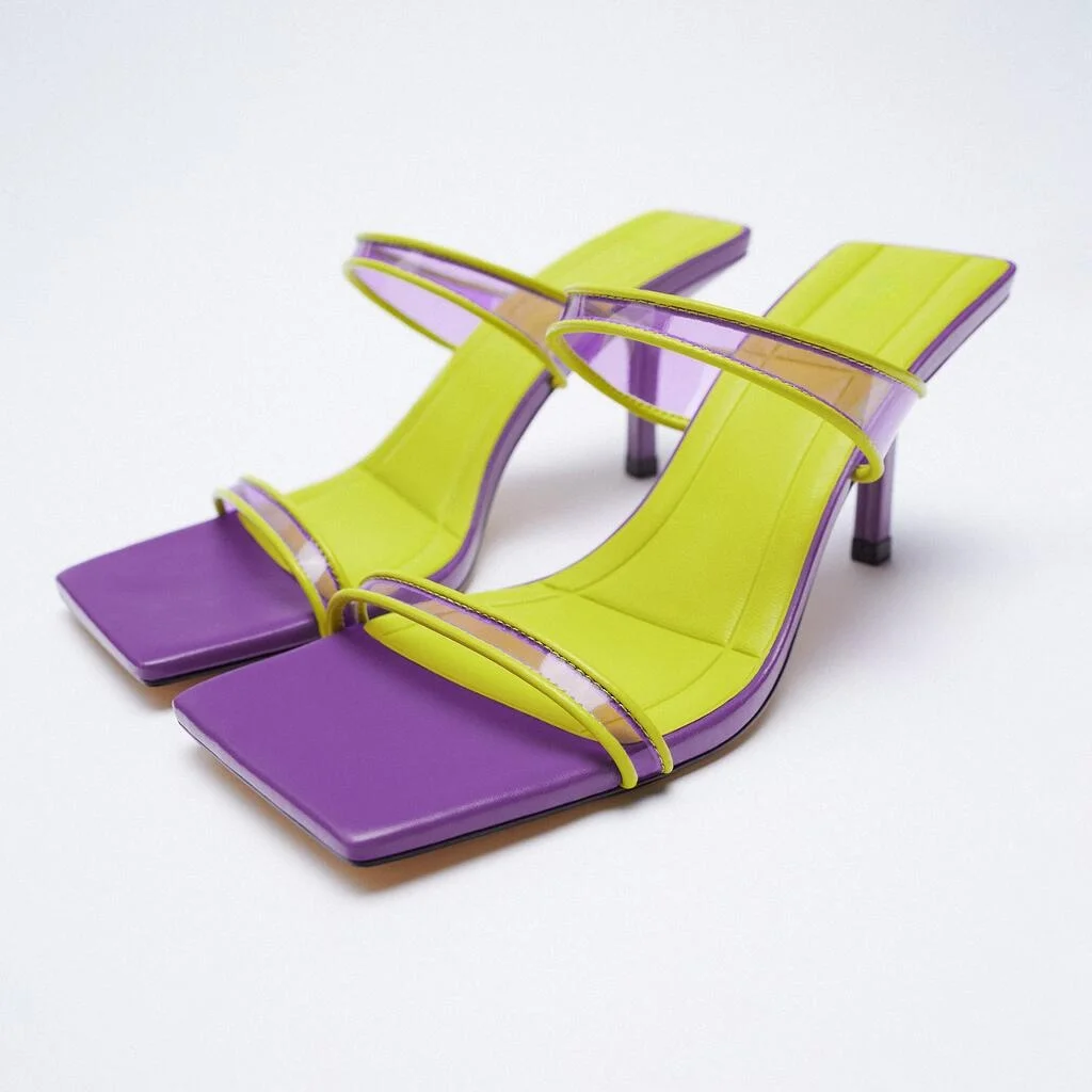 Женские босоножки с открытым носком Amoi, модные сандалии на высоком каблуке фиолетового и зеленого цвета, шлепанцы, Свадебная обувь для вечеринки, классические туфли