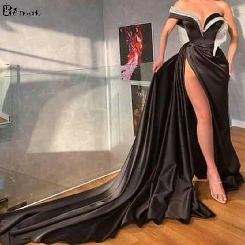 Женское вечернее платье-русалка, черное атласное платье с открытыми плечами и разрезом, с бусинами, для выпускного вечера, 2021