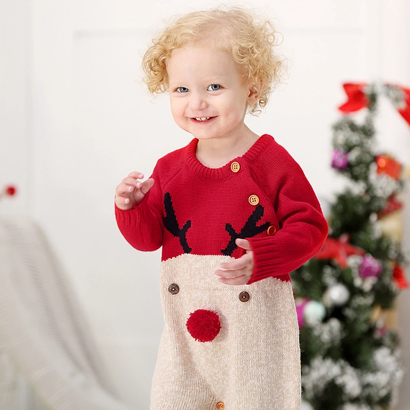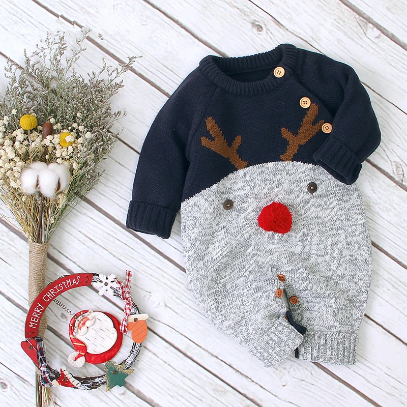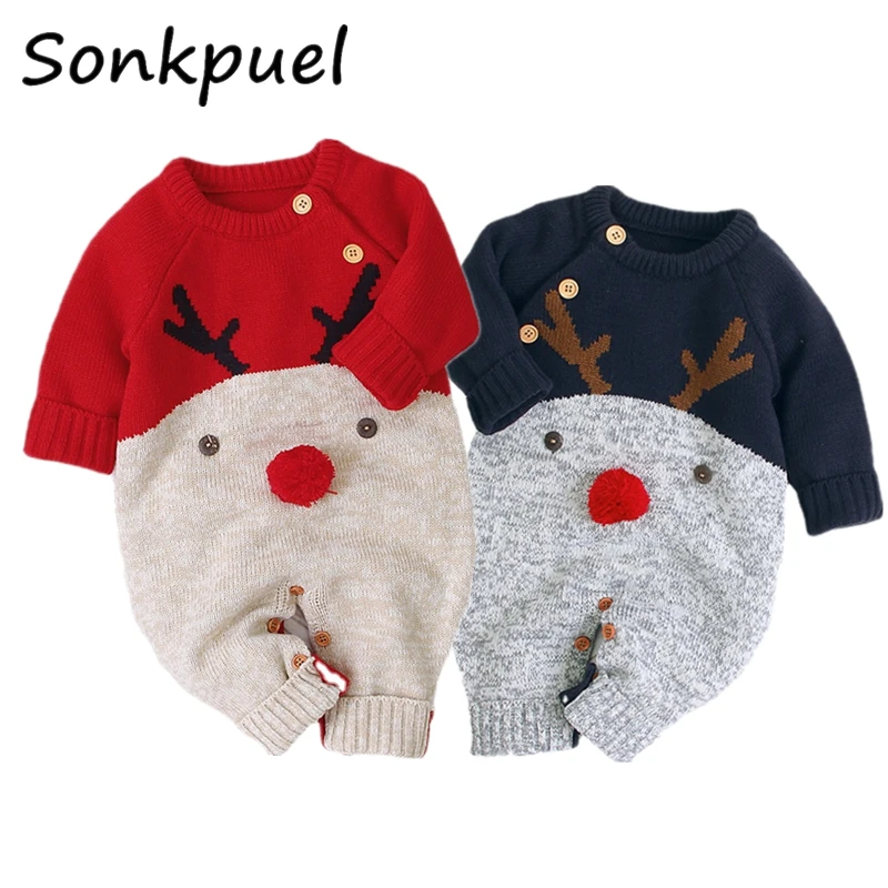 Рождественские Комбинезоны для маленьких мальчиков, вязаные детские комбинезоны с оленями, костюм для маленьких девочек на новый год, детская теплая шерстяная одежда