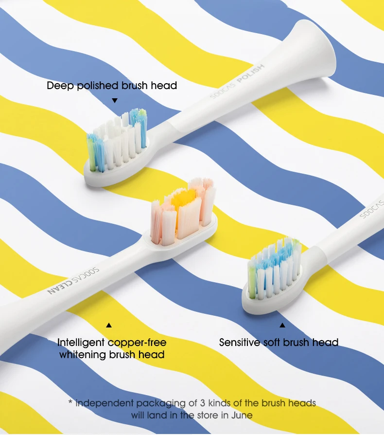 ● 3 вида головок: 1 Интеллектуальная отбеливающая щетка, 1 Чувствительная Мягкая головка щетки, 1 полировальная головка щетки.