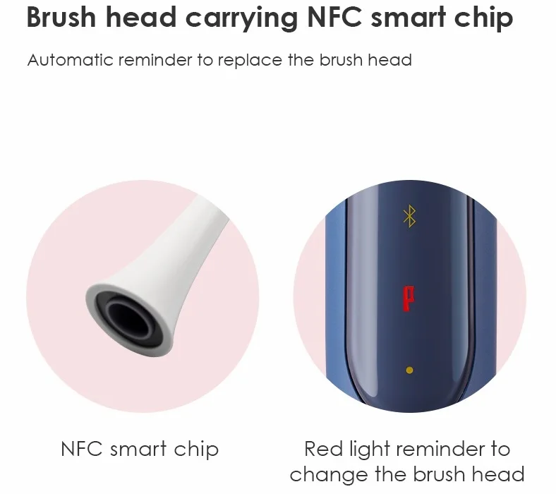 ● Ручка зубной щетки будет считывать частоту использования с внутренней головки щетки NFC, если частота использования более 180 раз (предположим, используется 2 раза в день, это означает, что 3 месяца), после включения индикатор (красный) предупреждения о замене головки кисти будет мигать, Чтобы напомнить пользователю о замене головки кисти. Индикатор погаснет после мигания в течение 5s, что не повлияет на нормальное использование.