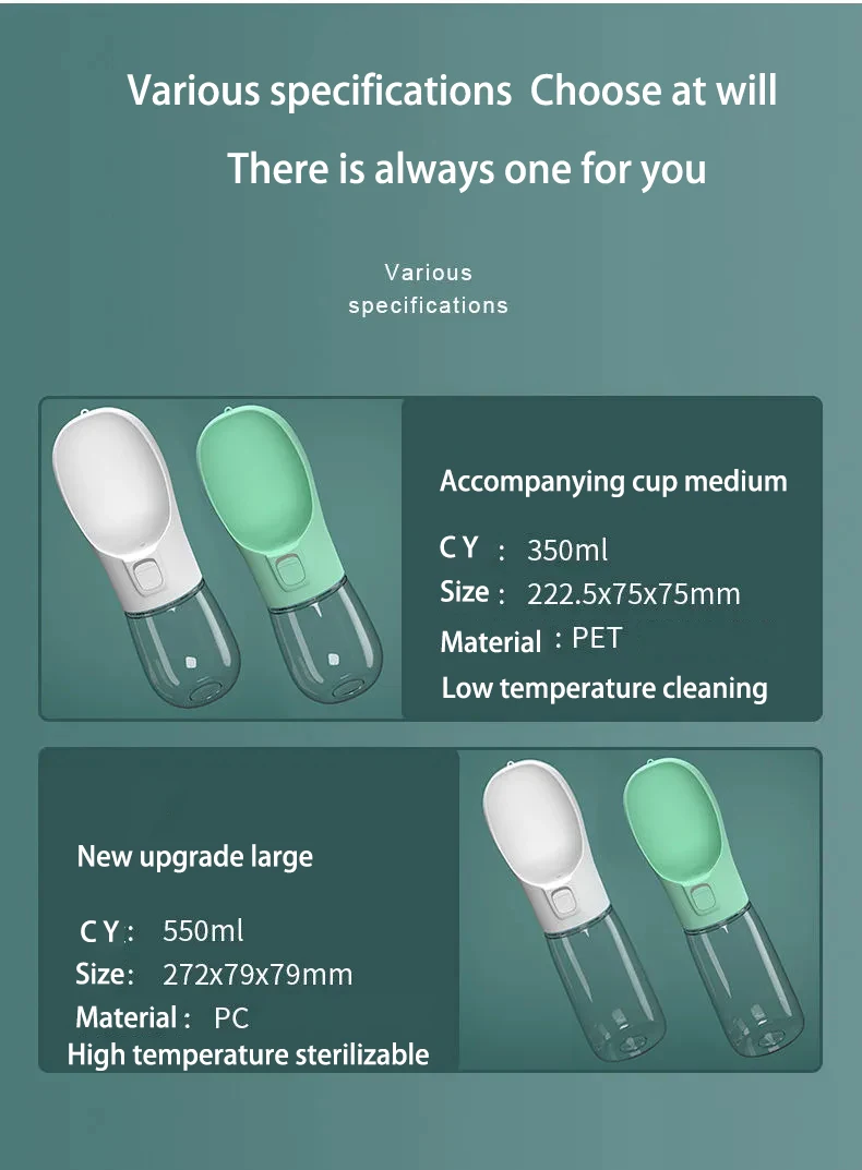 Бутылка для воды для собак с широким спектром емкости, от 300 мл до 550 мл. Размер, который вам нужен, будет зависеть от средней длины любой прогулки или прогулки, которую вы берете у вашей собаки. У нас есть 300 мл и 550 мл для вас на выбор, чтобы удовлетворить ваши различные потребности.