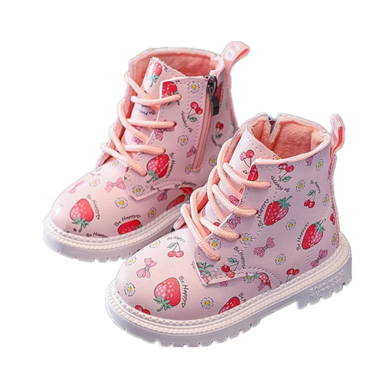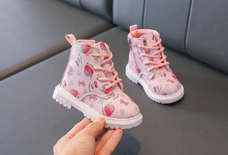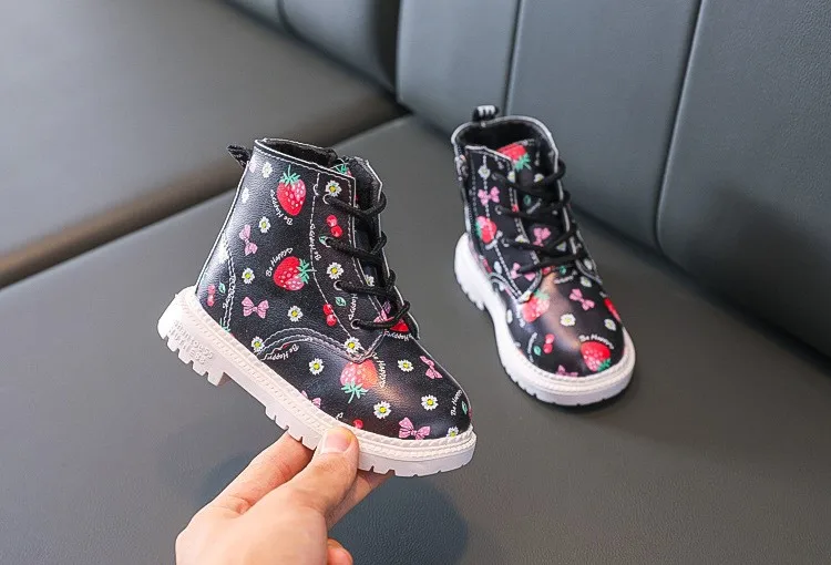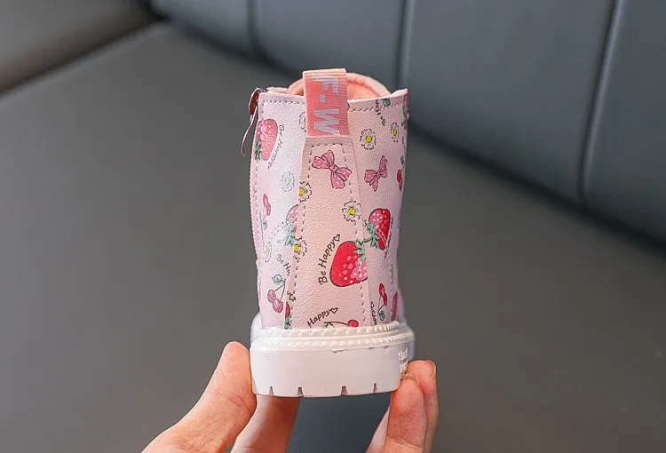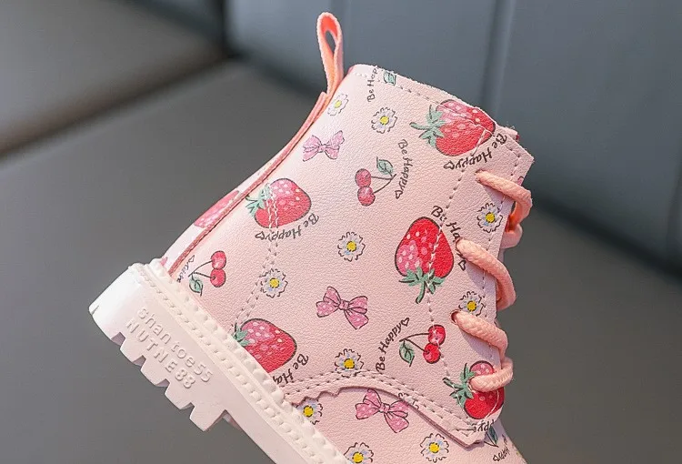Детская Хлопковая теплая обувь; Женские кожаные ботинки в британском стиле; Коллекция 2021 года; Сезон осень-зима; Новые ботинки Martin для девочек; Милая обувь с рисунком клубники