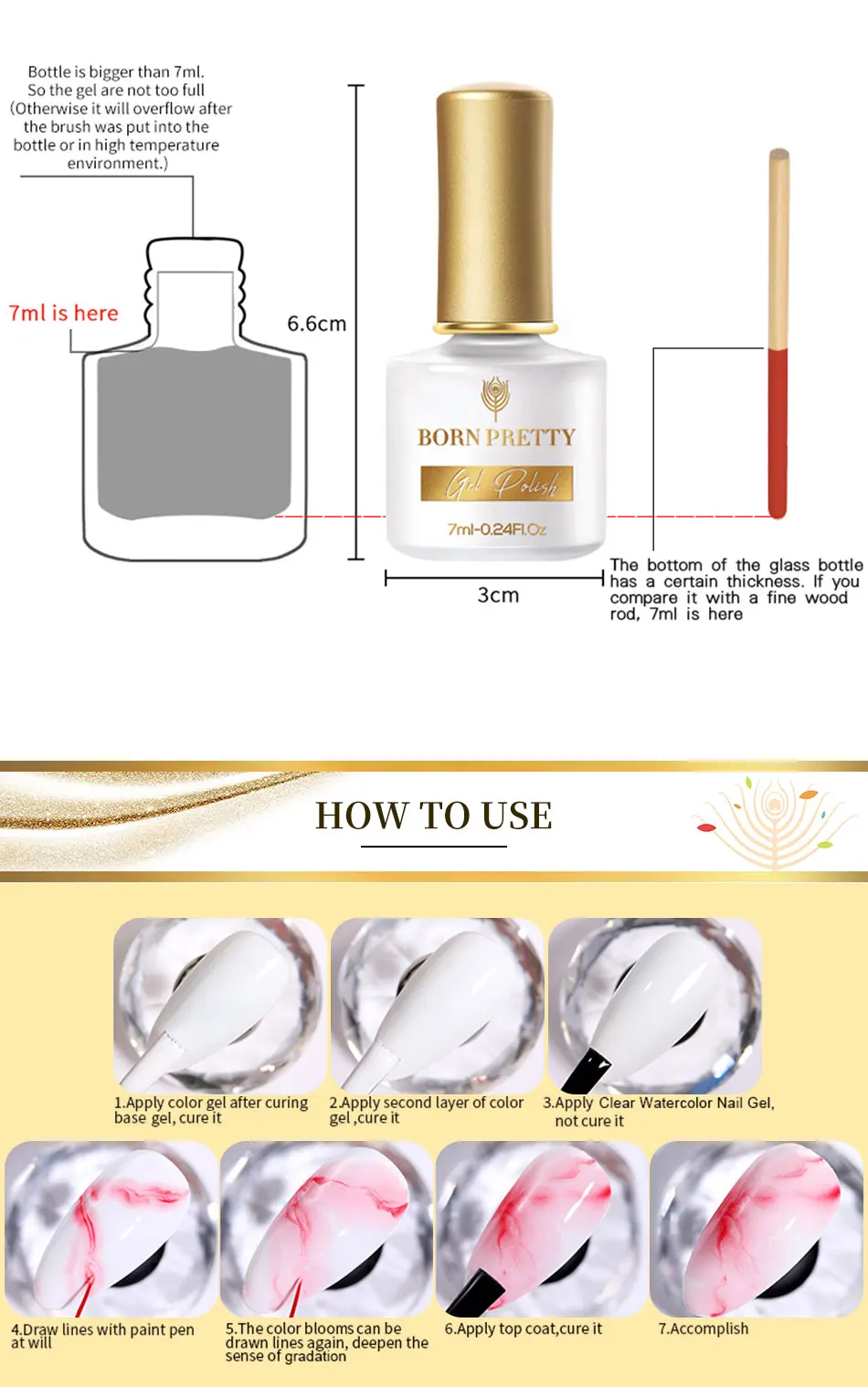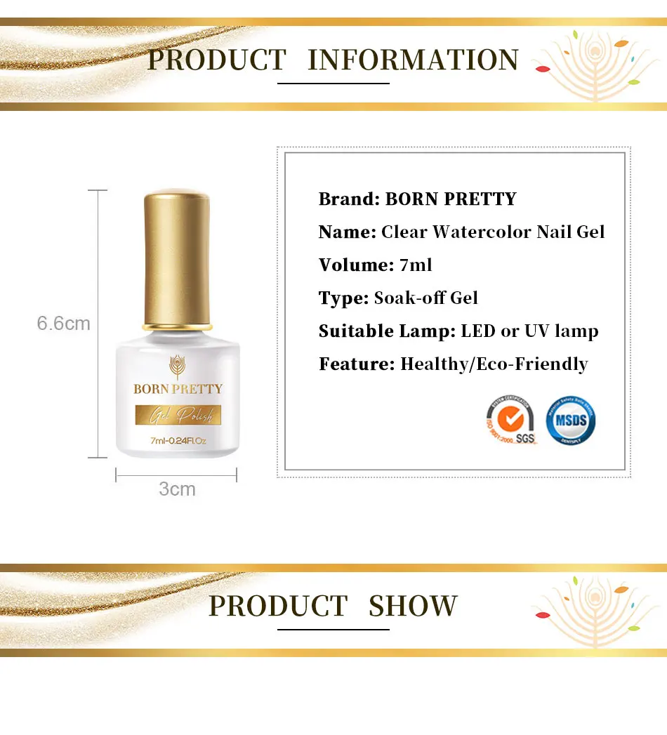 Спецификация:Бренд: BORN PRETTYТип: Гель-лакЦвет: прозрачныйКоличество: 1 бутылкаЕмкость: 7 млПодходящая лампа: УФ-лампа или светодиодный светильникПосылка:BORN PRETTY 1 флакон 7 мл функциональный гельХарактеристика:Он изготовлен из здоровых, экологически чистых, без ядовитых, резких химических материалов.Быстросохнущий УФ-светильник.Этот гель для ногтей легко наносится и впитывается.Позвольте вам профессиональный или домашний дизайн ногтей.Профессиональный подарок для ногтей для себя или вашей девушки.Профессиональное использование:Шаг 1. Очистите ногти, затем обрежьте поверхность ногтей как обычный процесс маникюра.Шаг 2. Полностью встряхните Гель-лак, он может сделать Гель-лак сбалансированным. (ВАЖНО)Шаг 3. Сначала нанесите базовый гель, который может сделать лак длительным, высушить УФ-лампой или светодиодный лампой. (Необходимо)Шаг 4. Нанесите первый слой цветного геля непосредственно, закрепите УФ-лампой в течение 2 минут или вылечите светодиодный светильник в течение 60 секунд.Шаг 5. Нанесите второй слой цветного геля, а затем немедленно закрепите УФ-лампой в течение 2 минут или вылечите светодиодный светильник в течение 60 секунд.Шаг 6. Нанесите акварельный гель для ногтей, не вылечите его.Шаг 7. Возьмите цветной гель с помощью ручки и нарисуйте линии по желанию.Шаг 8. Повторите шаг 7, чтобы углубить градацию цвета.Шаг 6. Пальто с верхним покрытием, излечивается УФ-лампой или светодиодный светильник.Удалите Гель-лак для ногтей шаг:• Замочите ногти в стеклянной миске, заполненной небольшим количеством ацетона, или оберните каждый ноготь в ватную подкладку, смоченную ацетоном, в течение 5-10 минут.• Продукт начнет становиться мягким, и вы можете аккуратно отпилить его или сдвинуть с помощью небольшой деревянной палочки.Теплое напоминание:1. Примечание: Пожалуйста, избегайте контакта с кожей. В чехол несчастного случая или в том случае, если вы чувствуете себя плохо, немедленно обратитесь к врачу. (показать на этикетке в тех случаях, когда это возможно)2. Плотно закрываются. Держите подальше от солнечного света. Хранить в недоступном для детей месте.