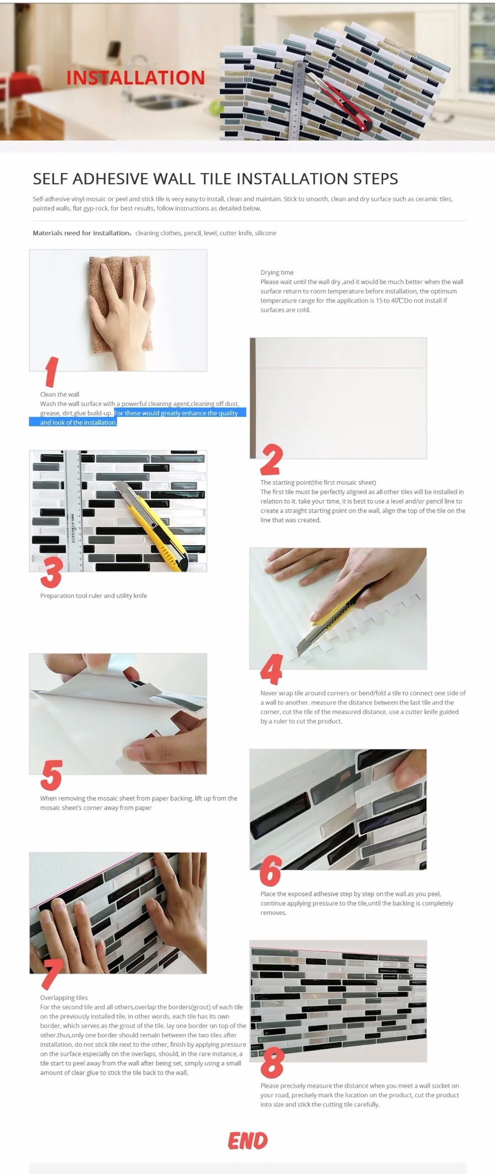 Описание продукцииОн имеет 3D эффект и ощущение блестящей стеклянной плитки.Используя алюминиевую фольгу, этот продукт прочнее, чем обычный лист ПВХ.Его можно наносить на изогнутую поверхность и угловую поверхность.И вы можете отрезать его ножницами или резцом для предпочтительной формы, чтобы вы могли использовать его не только стену.Простая и гибкая установкаЛегкая конструкция: может быть нанесена на изогнутую поверхность и угловую поверхность. И вы можете отрезать его ножницами или резцом для предпочтительной формы, чтобы вы могли использовать его не только стену.Никаких специальных инструментов не требуется.Это стикер продукта, так что вы можете прикрепить и отсоединить несколько раз.Различные типы* Имеет 3d-эффект и ощущение блестящей стеклянной плитки.* Просто очистите его влажным полотенцем, если он станет грязным.Обработка алюминиевой фольги* Используя алюминиевую фольгу, этот продукт прочнее, чем обычный ПВХ лист* Без вредных компонентов: без фталатов, без диоксинов, без кадмия, без ртути.