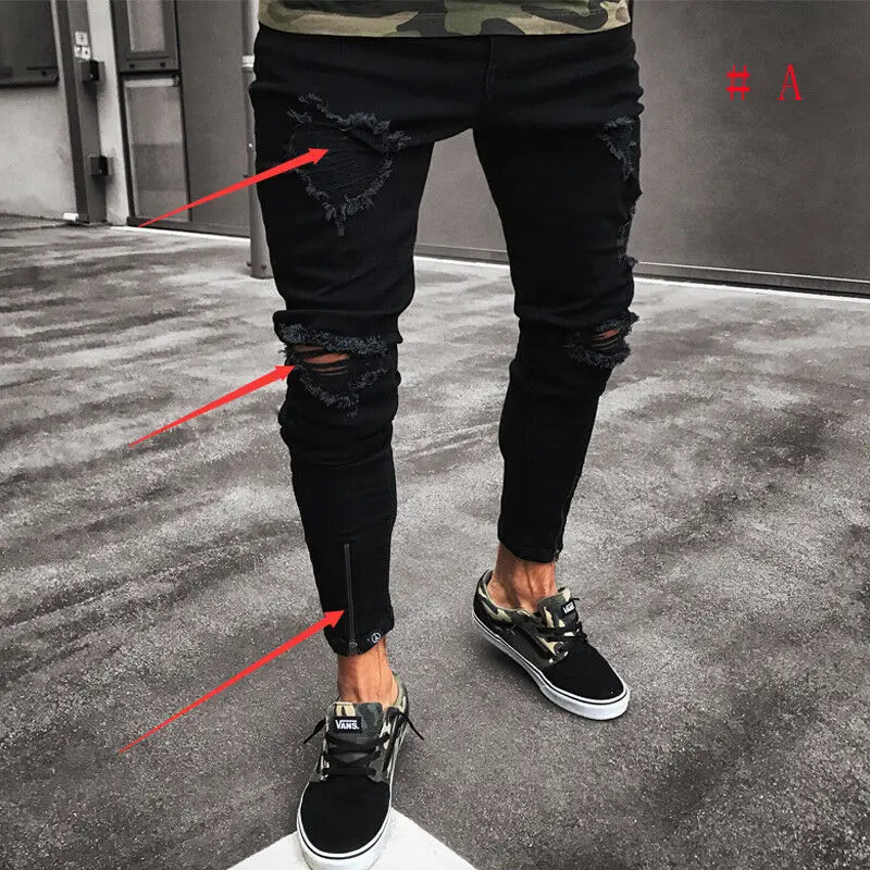 2021 черные эластичные облегающие джинсы на молнии, мужские рваные ...