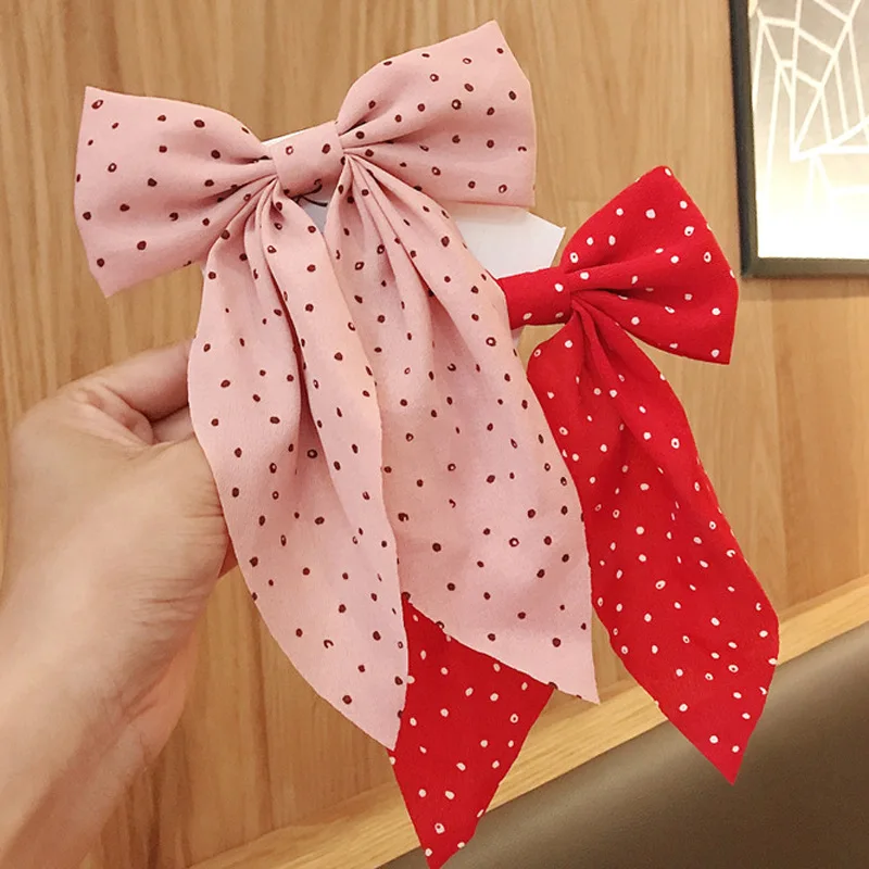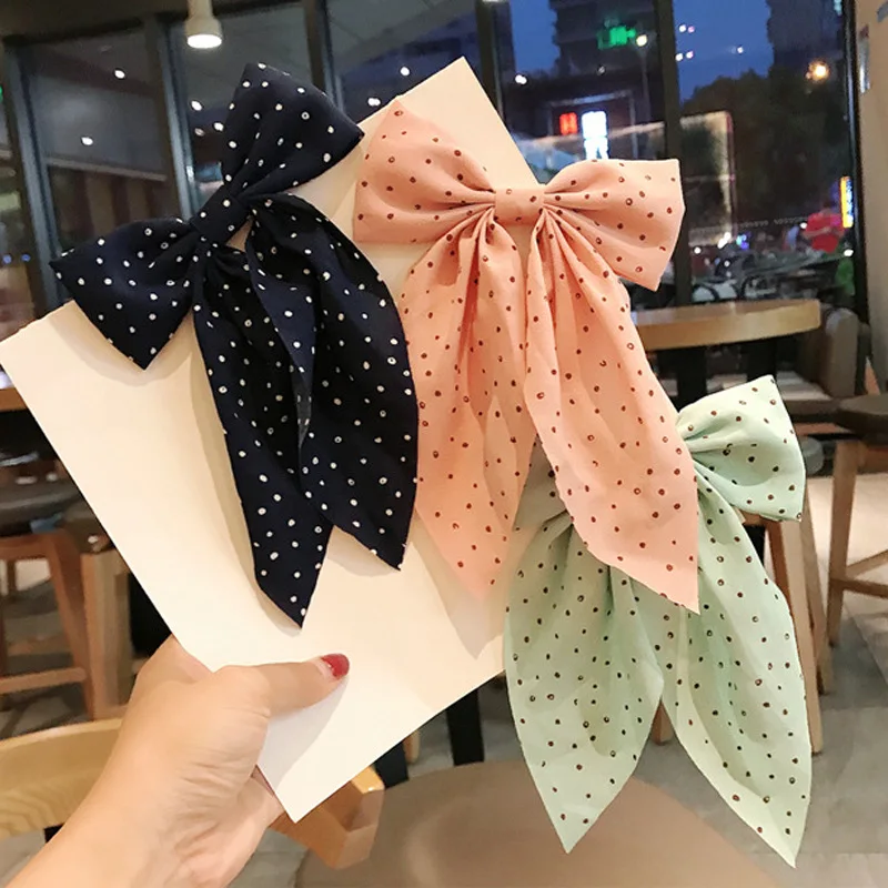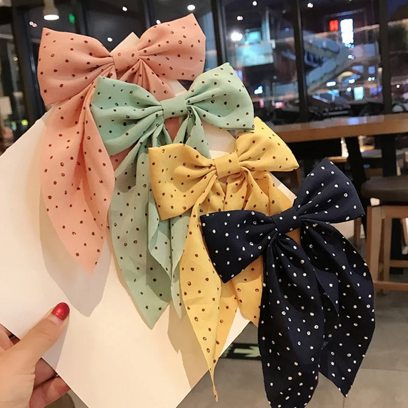 Длинные ленты для волос с принтом в горошек, милые заколки для волос с бантом, шифоновые шпильки для волос с узлом, аксессуары для волос для женщин и девочек