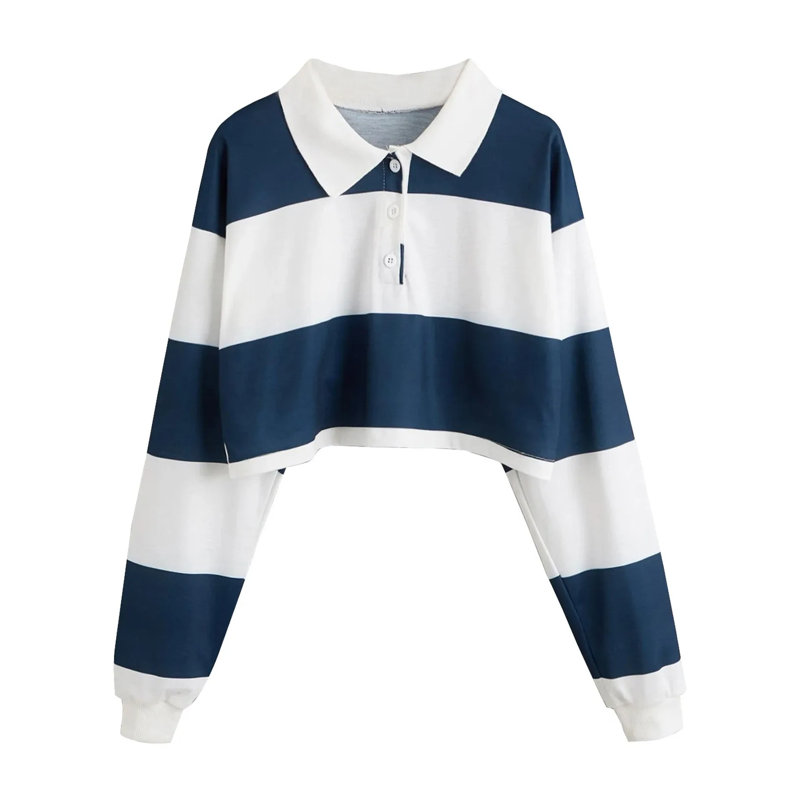 Модная полосатая футболка на пуговицах, Повседневная осенне-зимняя женская Свободная футболка, кроп-топы, женская рубашка с длинным рукавом, блузы, пуловер