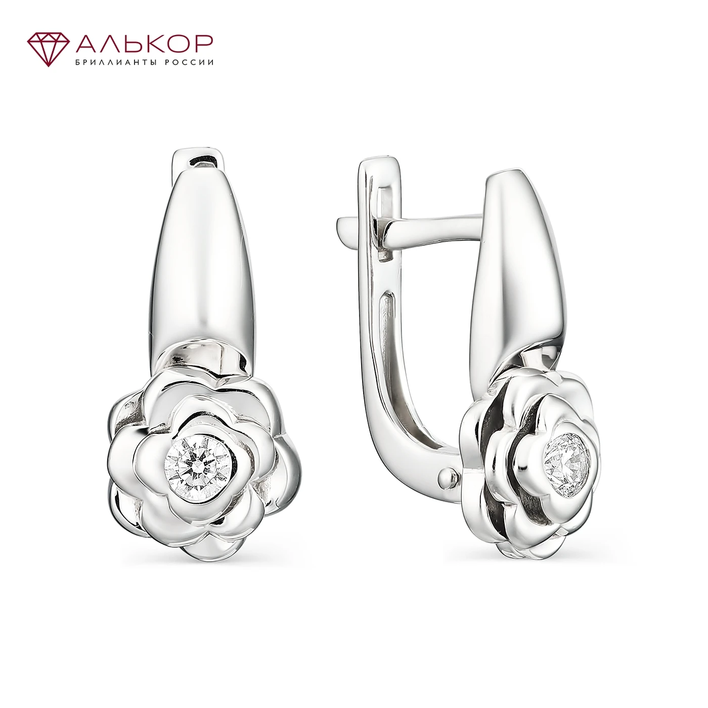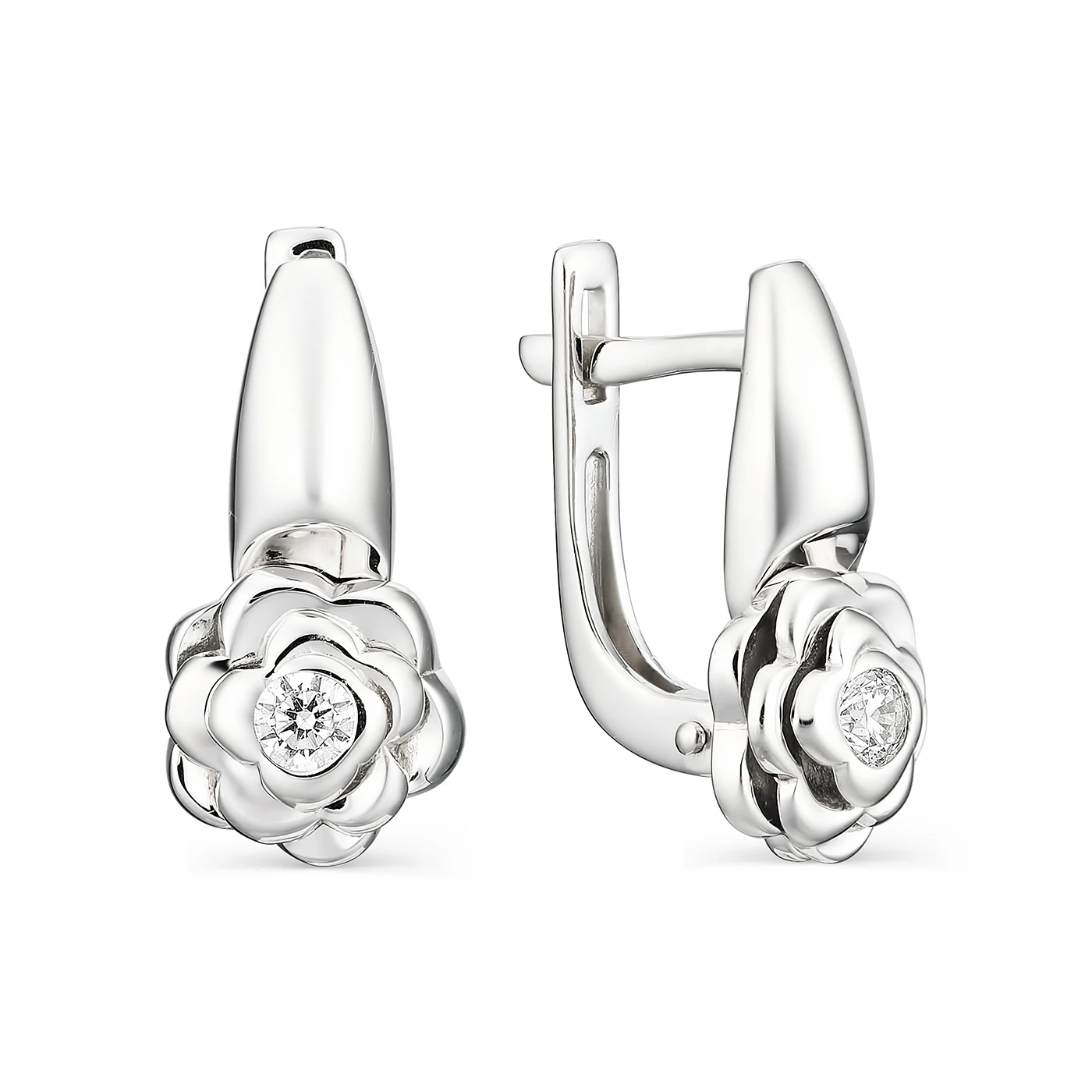 Серьги английский замок из родированного серебра c кристаллами АЛЬКОР. Бесплатная доставка с ювелирной фабрики в России. Мы покрываем серебро гипоаллергенным слоем родия толщиной 0,4 мкм, чтобы драгоценный металл получил благородный платиновый блеск и не потемнел со временем.