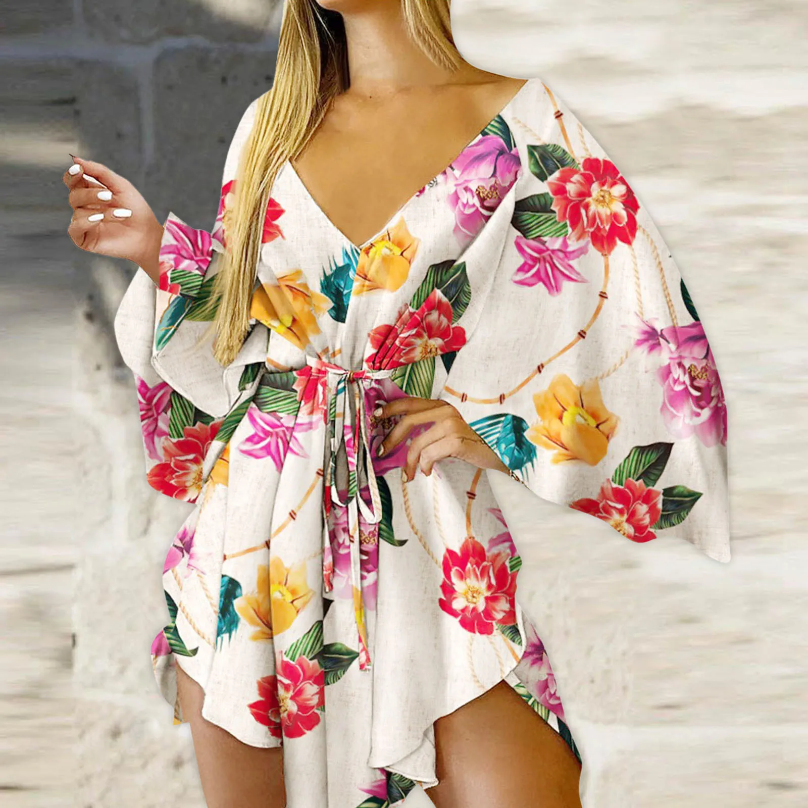 Женское кимоно с v-образным вырезом на шнуровке, мини-платье, хлопковое расклешенное платье с длинными рукавами и поясом, стильное летнее свободное платье