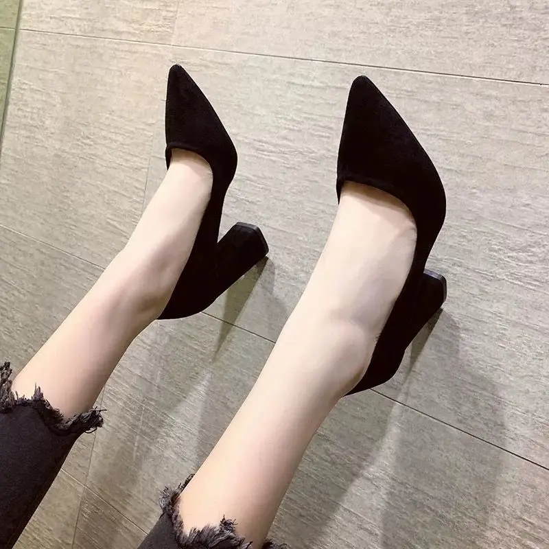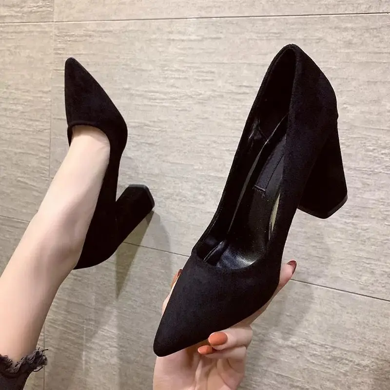 Женские туфли на высоком каблукеоднотонные туфли, подходящие ко всему женские осенние новые черные замшевые профессиональные рабочие туфли с острым носком на толстом каблуке