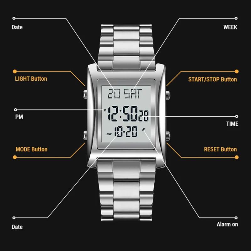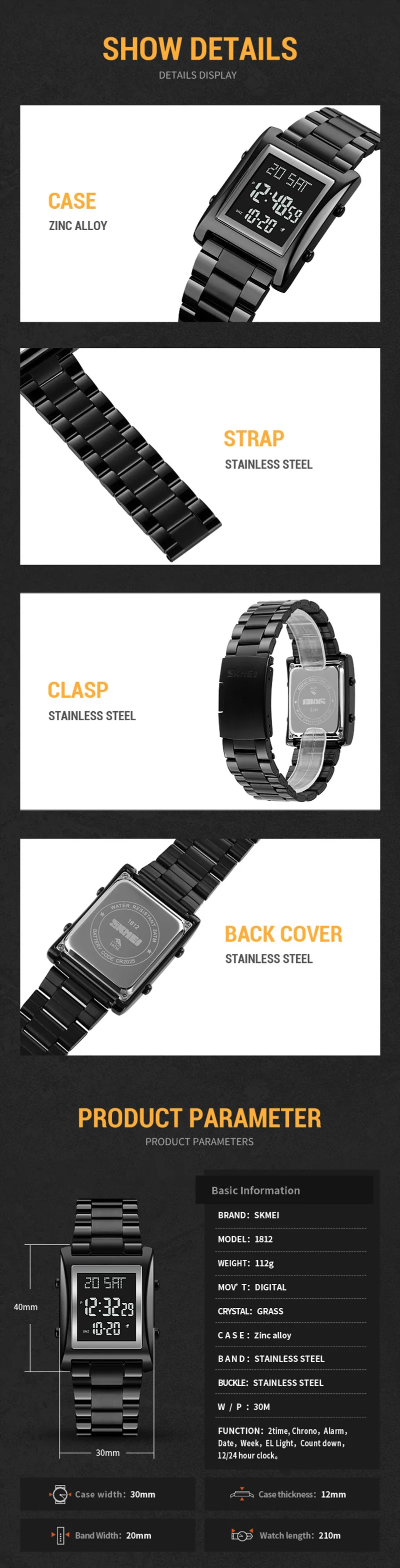 Марка: SKMEI механизм: электронное движение с японским аккумулятором функции: Двойное время, хронограф, секундомер, обратный отсчет, дата отображения недели, Будильник с таймером, световой, 12/24 часовая система, ежечасный хронометраж Материал: чехол из цинкового сплава, ремешок из нержавеющей стали, стеклянное зеркало, задняя крышка из нержавеющей стали, Пряжка из нержавеющей стали