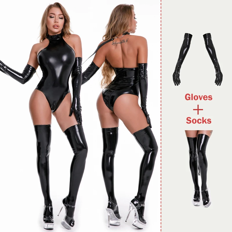 Сексуальное боди AIIOU из искусственной кожи, боди, сексуальное нижнее белье Тедди, женское эротическое боди с перчатками и носками, сексуальные костюмы хозяйки